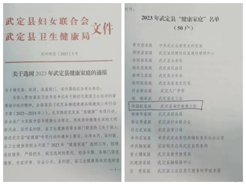 为认真贯彻习近平总书记关于家庭文明建设的重要指示精神,深入实施“家家幸福安康工程”,发挥家庭家教家风在基层社会治理中的重要作用,宣传倡导社会主义核心价值观在家庭中落细落小落实,不断深化家庭文明新风尚,武定县妇女联合会、卫生健康局组织开展了2023武定县“健康家庭”选树活动。经过积极发动、层层推荐、评审领导小组评审等程序,评选结果于近日公布,武定县中马消防救援站师园凯家庭喜获殊荣。