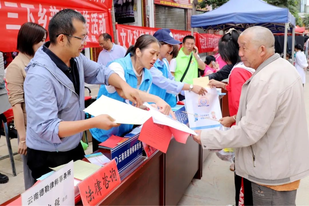 在活动现场,县司法局工作人员和辖区内律师采取悬挂宣传标语、设立法律咨询台、发放法治宣传资料等方式,向群众宣传党的方针政策,普及民法典、法律援助法、农民工维权、行政复议法等相关知识,推广“云南掌上12348”微信公众号,并细心解答在日常生产、生活中遇到的法律难点,引导群众运用法律武器维护自身合法权益,以法治之力保障群众安居乐业。此次活动共发放普法宣传口袋书、折页、环保袋等宣传产品2600余份,解答群众法律咨询30余人。