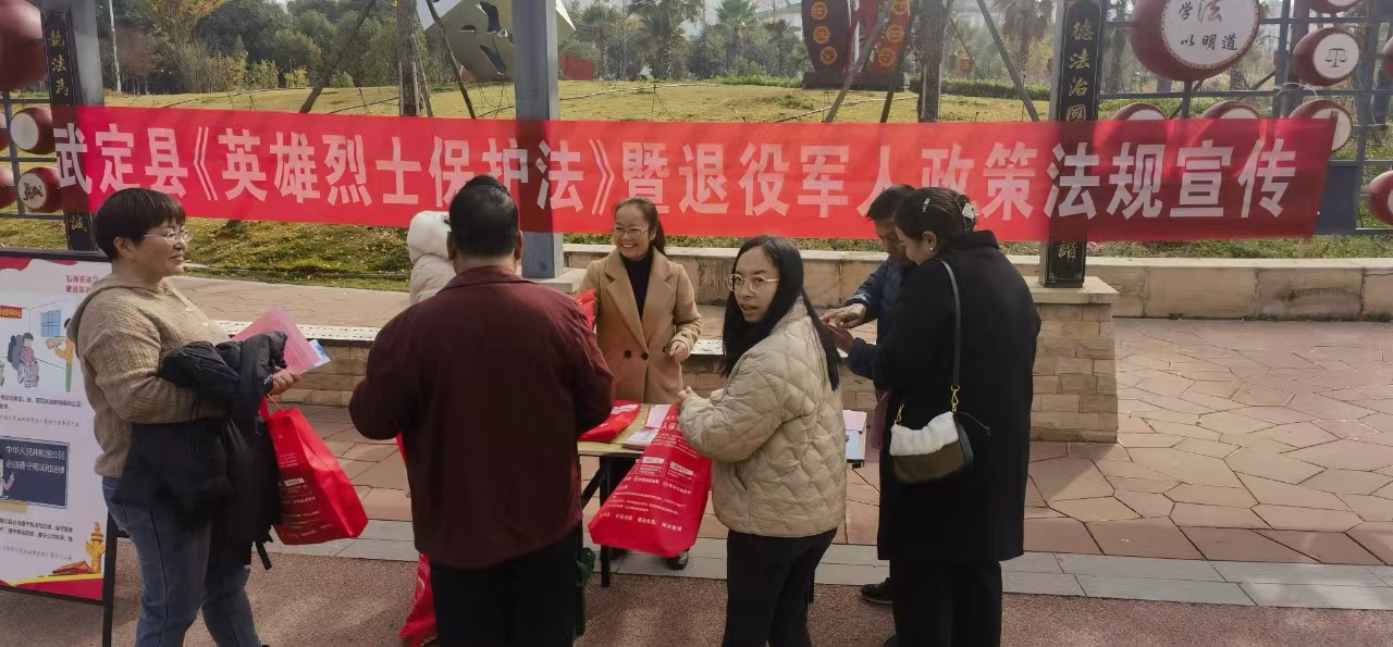 三是开展集中宣传。组织干部职工到武定县乌龙河法治文化主题公园开展了“宪法宣传日”集中宣传活动,共发放退役军人保障法、国防法、兵役法、英雄烈士保护法等内容的宣传单(册)100余份。
