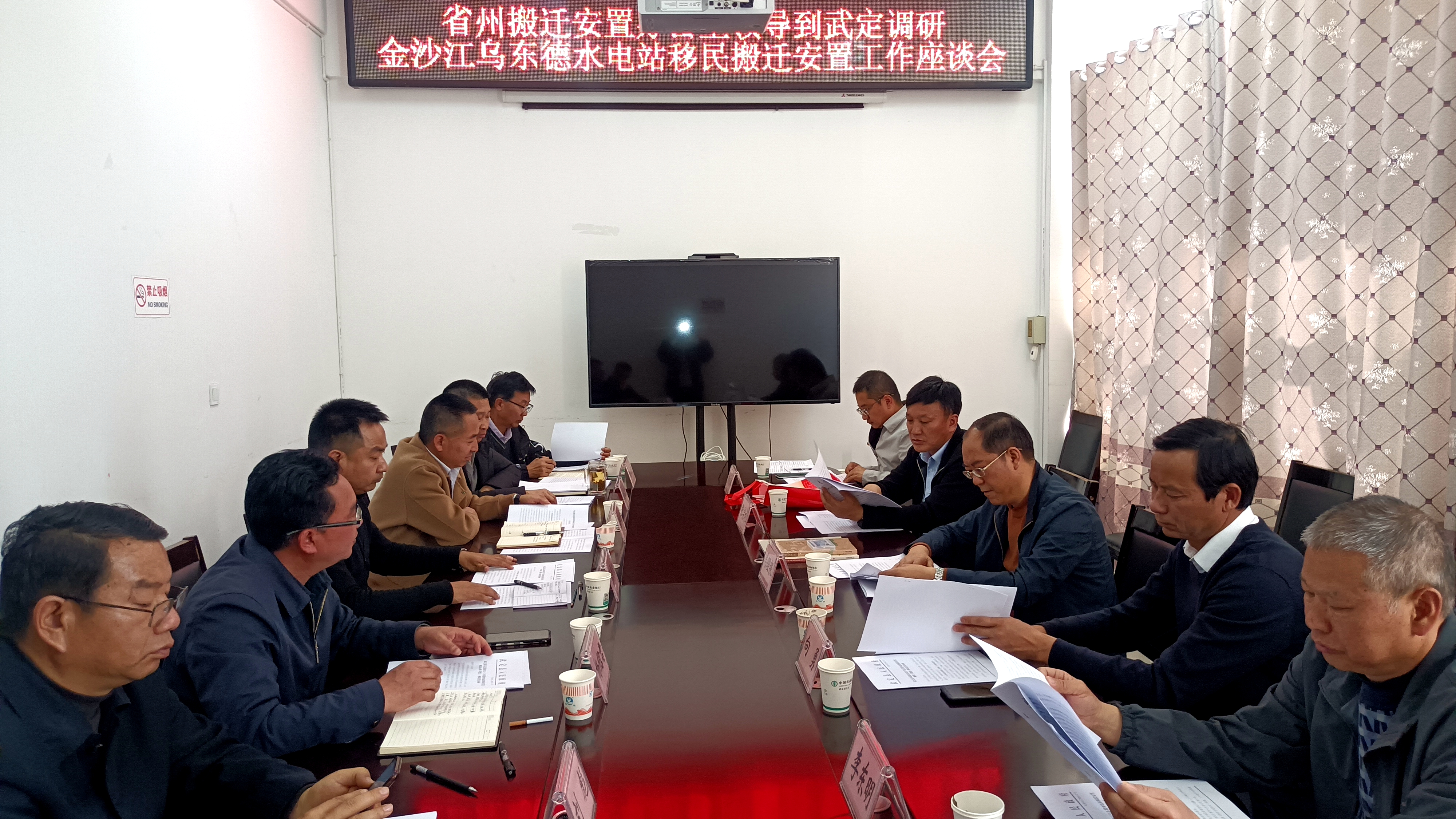随后,调研组在武定县搬迁安置办公室召开座谈会,听取了武定县乌东德水电站建设征地移民搬迁安置收口收尾工作情况和移民信访维稳情况汇报。调研组对武定县乌东德水电站移民搬迁安置工作取得的成绩表示肯定,就加快推进移民搬迁安置收口收尾工作进行了指导。