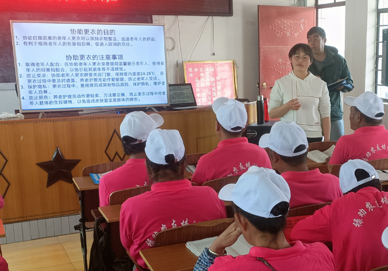 培训班上,禄劝农友培训学校的老师主要以养老护理技能培训为主要内容,涵盖老年健康护理知识、日常护理技能培训、认知疗法与情绪化护理、老年生活方式与营养饮食指导等。课程安排方面,分为理论课教学与实践操作课程,以提高学员对养老护理工作的理论认识和实际操作能力。培训课程通过系统的教学计划和课程表进行安排,确保学员能够全面学习养老护理技能,掌握相关知识,并将其运用到实际工作中去。