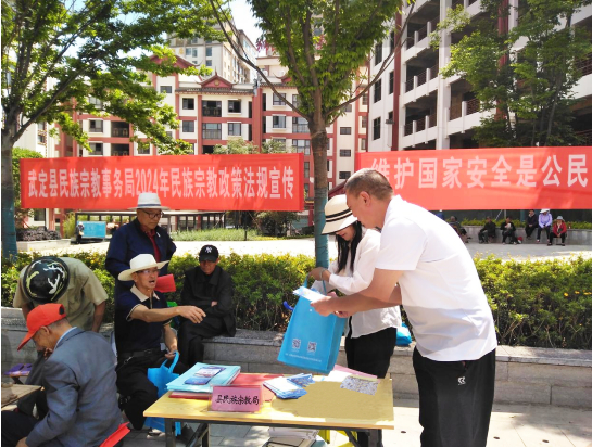 为扎实深入推进普法强基补短板专项行动,认真履行“谁执法谁普法”的职能职责。4月12日,武定县民族宗教事务局紧扣“铸牢中华民族共同体意识”工作主线,精心组织,在武定狮山大道法治文化广场开展“民族宗教政策法宣传月暨民族团结进步宣传教育月”集中宣传活动。