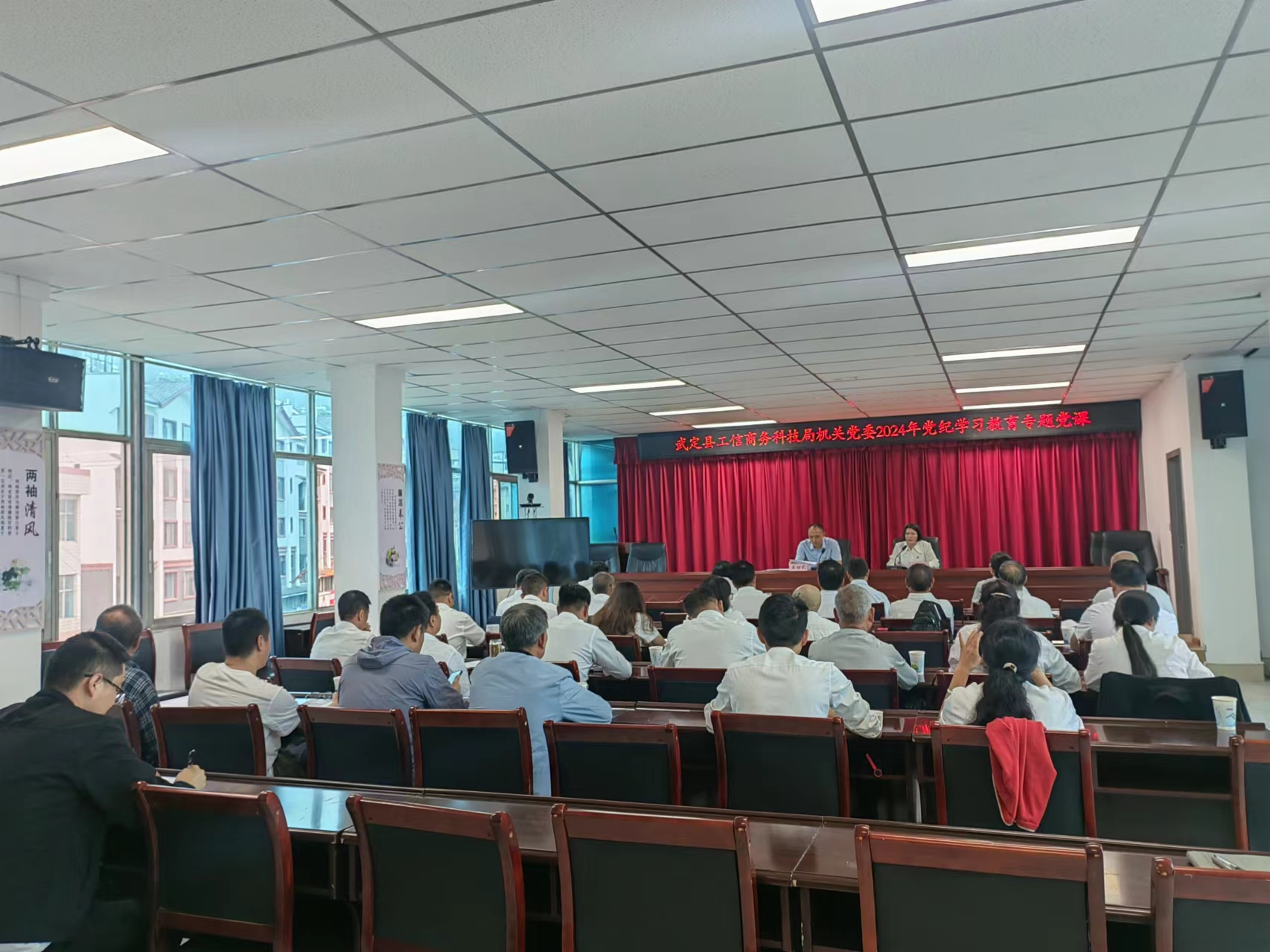 2024年7月5日,县纪委书记姜绍武为党建联系点党支部县工信商务科技局机关支部党员干部讲授党纪学习教育专题党课。