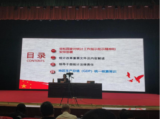 陈世槐围绕党和国家对统计工作指示批示精神和安排部署、统计改革重要文件及内容解读、领导干部统计法律责任及地区生产总值(GDP)统一核算常识四个方面为全县领导干部作了生动的辅导。最后通报了一批国家统计局近期查处的统计违纪违法案例,为全县领导干部敲响了整治统计违法的警钟。