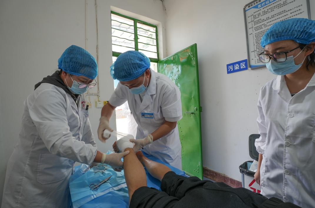 随后,帮扶队来到猫街镇卫生院开展义诊。他们认真为患者诊治,耐心解答患者疑惑,现场气氛热烈,村民们纷纷前来咨询和就诊。李乔红队长为一名右足外伤的村民缝合伤口,并指导医护人员,讲解清创缝合要点、后续处理方法和注意事项。义诊结束后,专家们深入科室,开展教学查房活动。针对疑难病症患者,还进行了深入的会诊,共同探讨最佳的治疗方案。