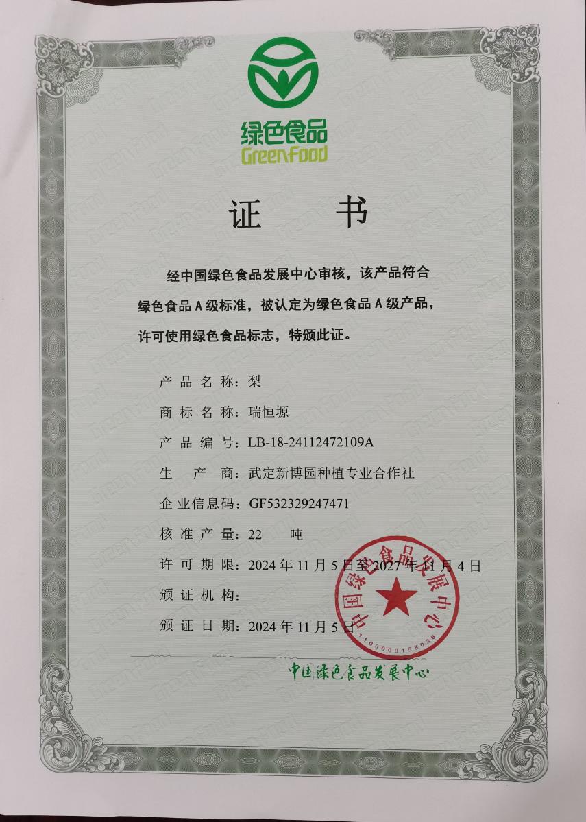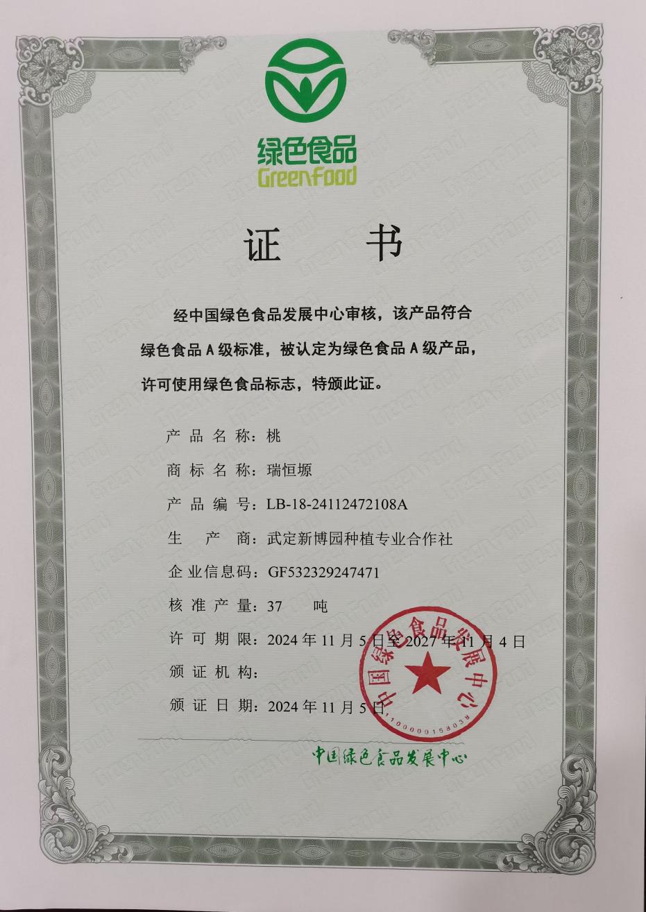 近日,武定新博园种植专业合作社申报的李、桃、梨三个产品正式取得中国绿色食品发展中心颁发的绿色食品证书,认定为绿色食品。