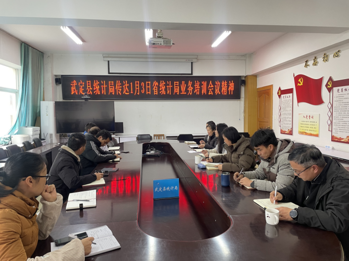 1月3日,省统计局召开全省统计业务视频会议。武定县统计局高度重视,认真组织班子成员参加培训。省视频会结束后,第一时间对全省统计业务视频会议精神进行传达学习,会议由局长陈世槐主持,全体干部职工参加会议。