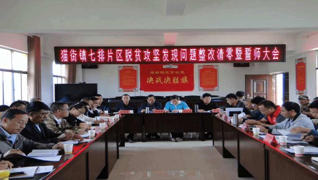 在大会上,七排村委会、龙庆光村委会、秧草地村委会分别汇报了脱贫攻坚工作情况,针对各村委会对工作中提出的问题,猫街镇党委分别逐一进行现场解答,明确责任人并制定工作方案,限期解决问题,有力推动脱贫攻坚发现问题整改清零,三个村委会挂包单位领导在大会上进行脱贫攻坚表态发言,将认真履行帮扶单位职责,做好各项工作,确保各项脱贫攻坚任务如期完成。