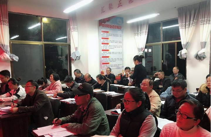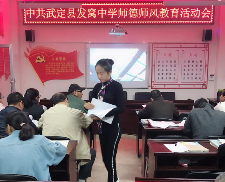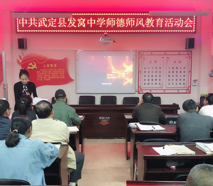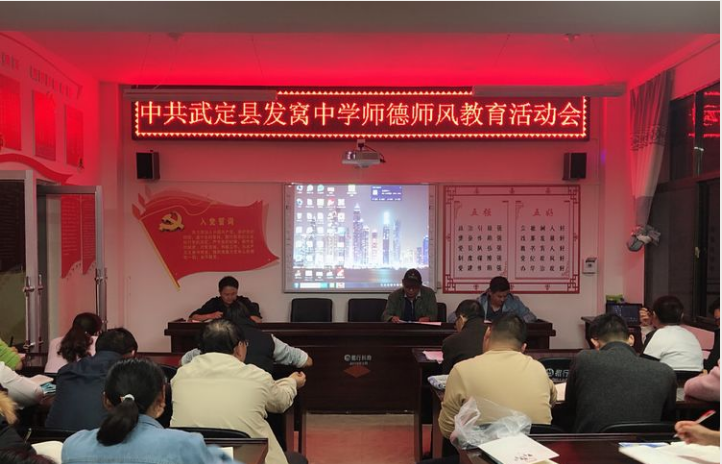 为深入学习贯彻党的十九大精神,扎实推进社会主义核心价值体系建设,不断提升我校教师的道德素质,加强我校师德师风建设,做人民满意的教师,营造:“ 讲师德、重责任、讲奉献、树形象”的浓厚氛围,2019年10月8日19点,中共武定县发窝中学党支部在大会议室举行了师德师风学习专题教育活动会。会议由副校长朱维光同志主持,共有四项议程。题目是:《师德化于形,润物细无声》。
