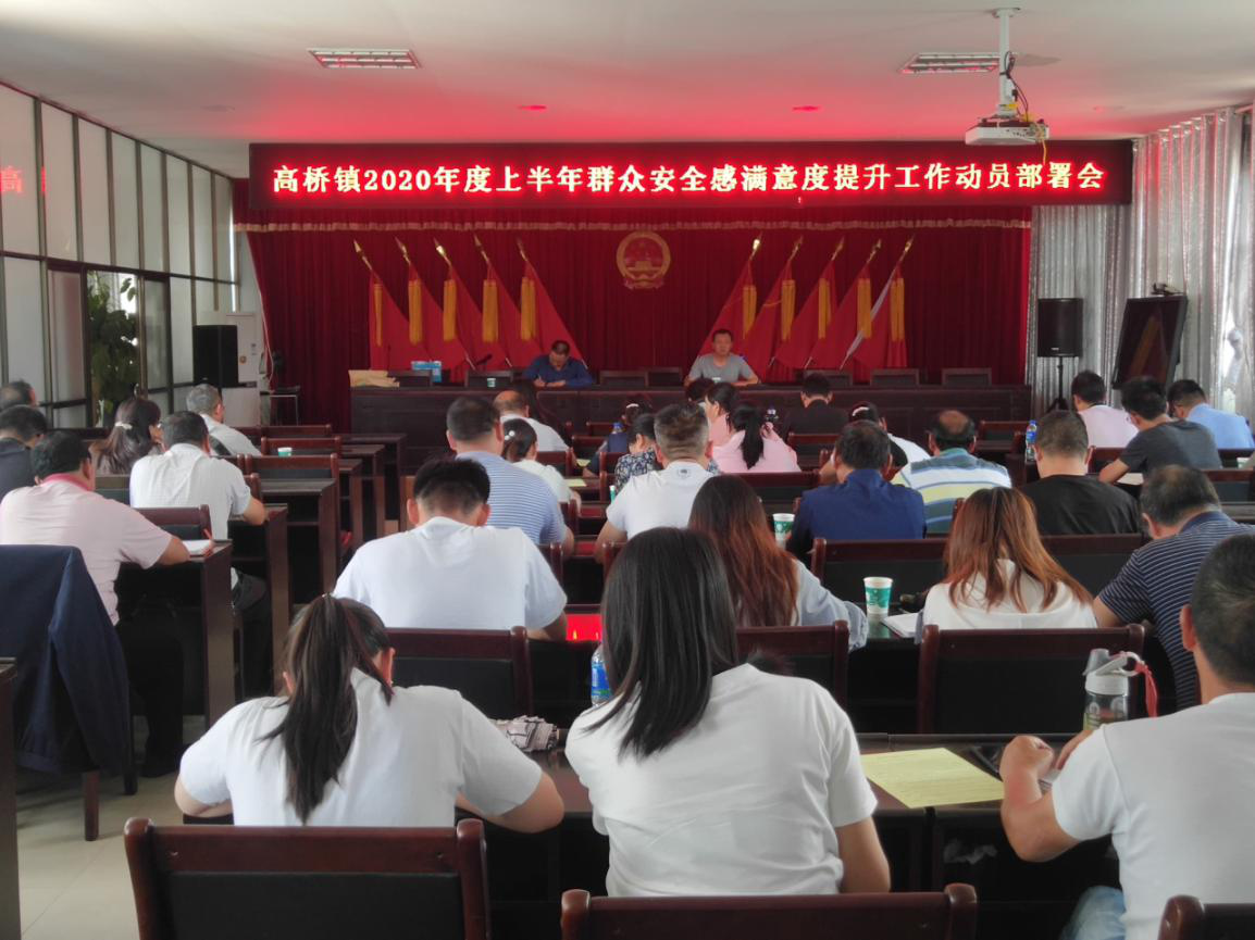 平安幸福是人民群众的美好期盼,和谐发展是党和政府的奋斗目标。为有效贯彻县委会议精神、扎实推进高桥镇群众安全感的满意度提升工作,2020年6月2日13时高桥镇组织召开2020年上半年群众安全感满意度提升工作动员部署会。