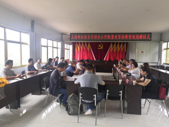 在捐赠仪式现场,高桥镇党委书记李文武同志向上海市嘉定区长期以来的关心和大力支持表示感谢,对小河村贫情作了详细汇报。随后,嘉定区合作交流办常务副主任潘展平代表上海市社会力量向高桥镇小河村委会捐助扶贫资金123.25万元,用于小河村扶贫项目开发。潘展平同志表示,攻克挂包督战村是最后的贫困堡垒,我们要齐心协力帮助打赢打好脱贫攻坚战。受捐赠的小河村委会向9家社会组织赠送了锦旗。