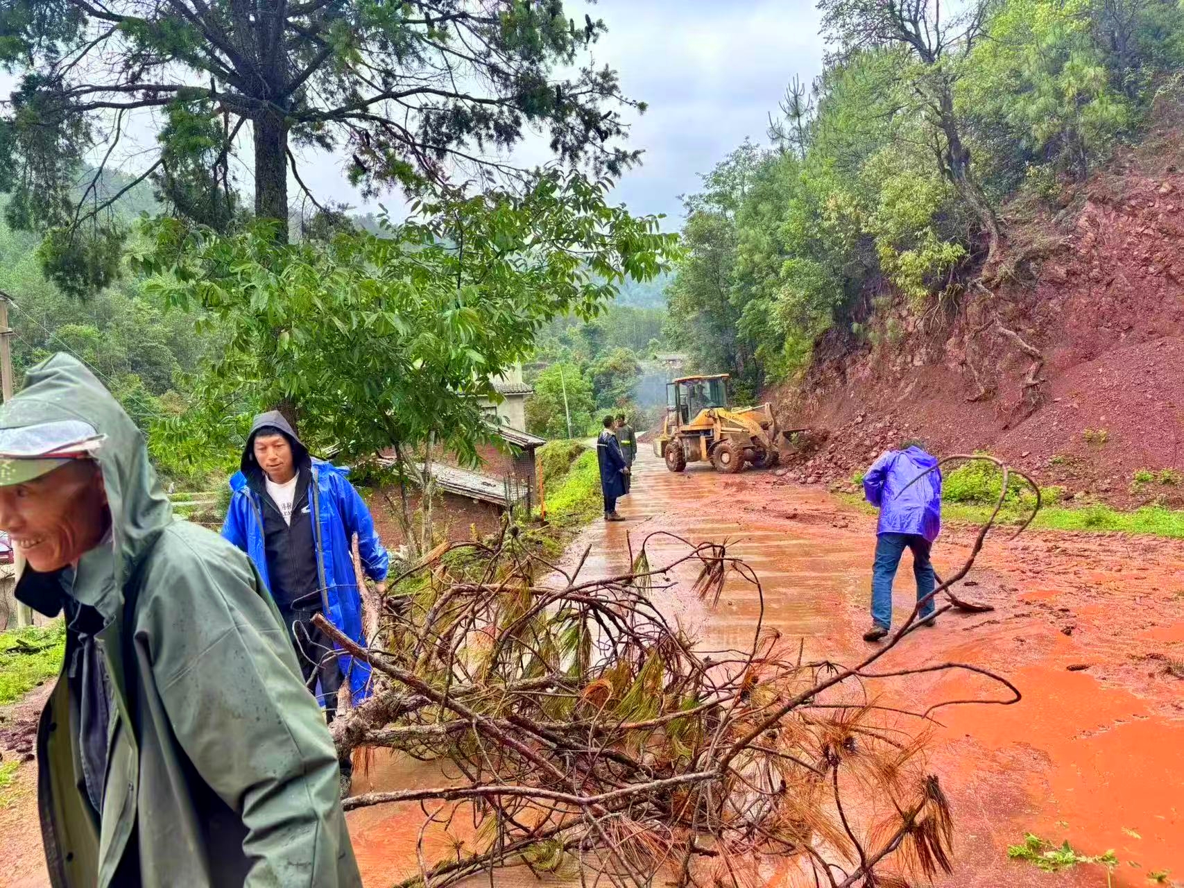 持续强降雨让村道“很受伤”,两侧山体碎石滑落、泥土堆积,路面泥泞难行,成了村民出行的“绊脚石”。村干部带头,护林员紧跟,大家穿雨衣、踩泥地,铁锹挥动间,大块碎石被撬起清运,堆积的泥土被扫帚扫净,装载机配合清理山体滑落的土石方,现场虽忙碌却有序,雨水混着汗水,一步步打通村民的“安全通道”。