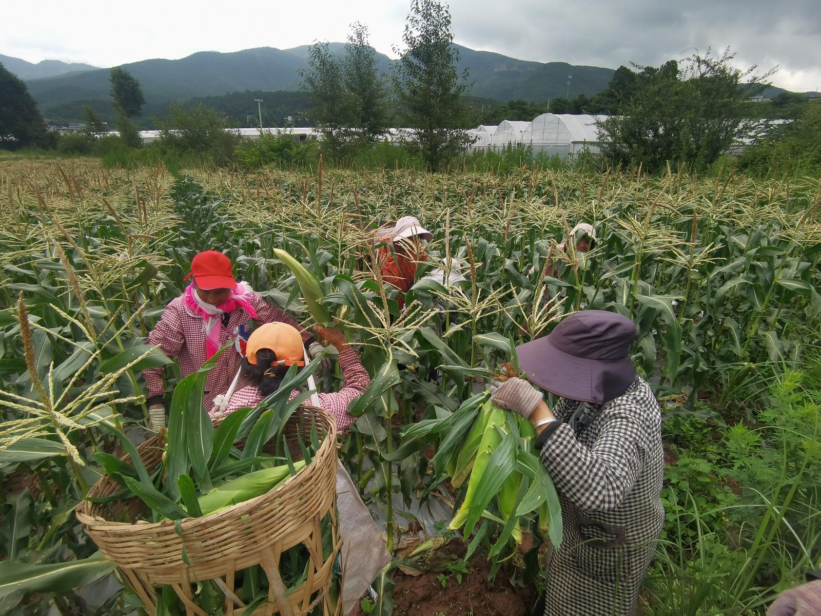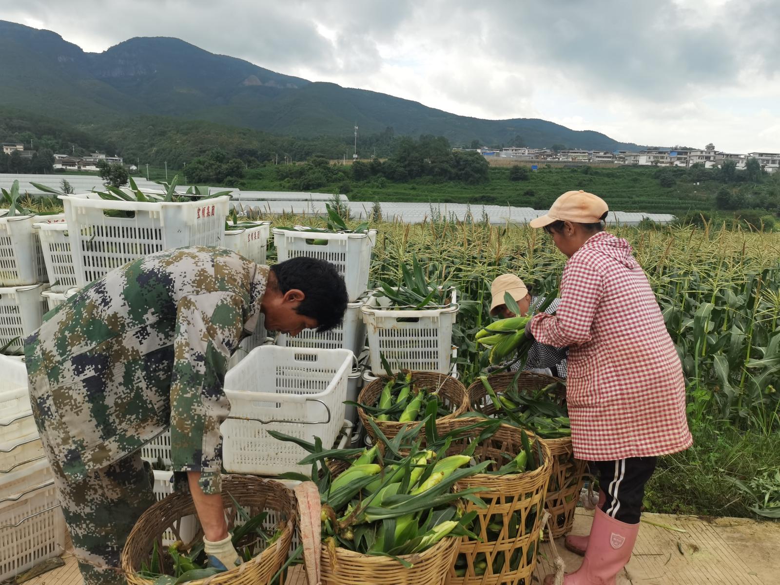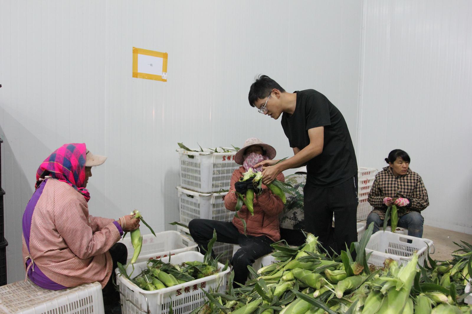 村民们要在太阳出来前把玉米掰好装筐,保证不要让太阳晒了影响玉米口感;村干部们忙着把掰好的玉米装筐送往冷库,保证玉米的新鲜度。同时,芸岭鲜生武定有机种植生产基地的技术人员在基地冷库给村民讲解如何将分级装筐,保障销售到广州、上海的这2万棒牛奶玉米能卖个好价钱。