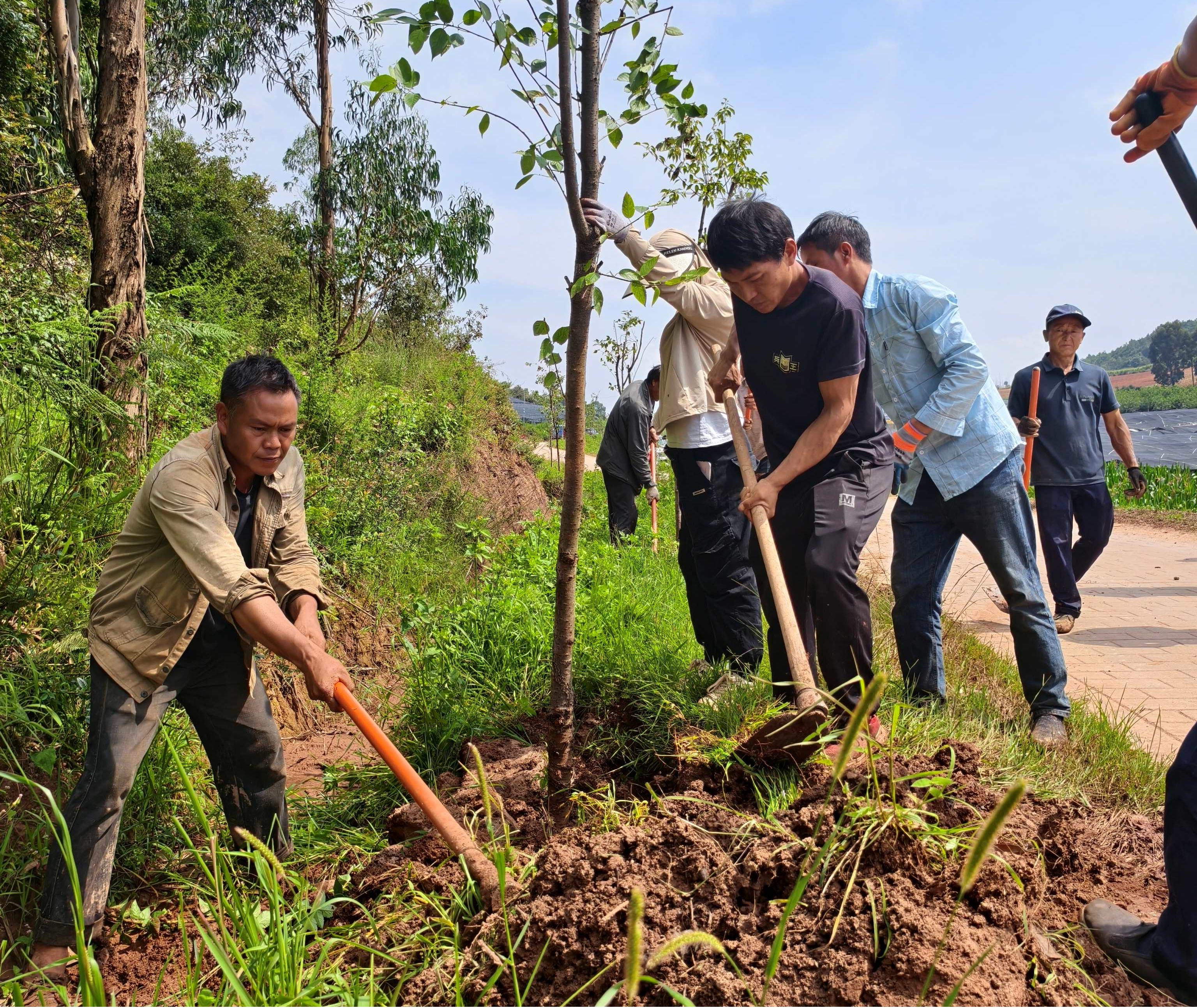 在羊旧关集中植树点现场,镇、村干部和群众积极行动,党员干部以身作则,充分发挥模范带头作用,挥锹挖坑、扶正树苗、压实回填、提水浇灌,大家分工协作、各司其职。经过两天的辛勤劳动,接连种植了桂花、银杏、云南樱花等树苗,一棵棵新栽种的树苗亭亭玉立,在明媚的阳光中展现勃勃生机。