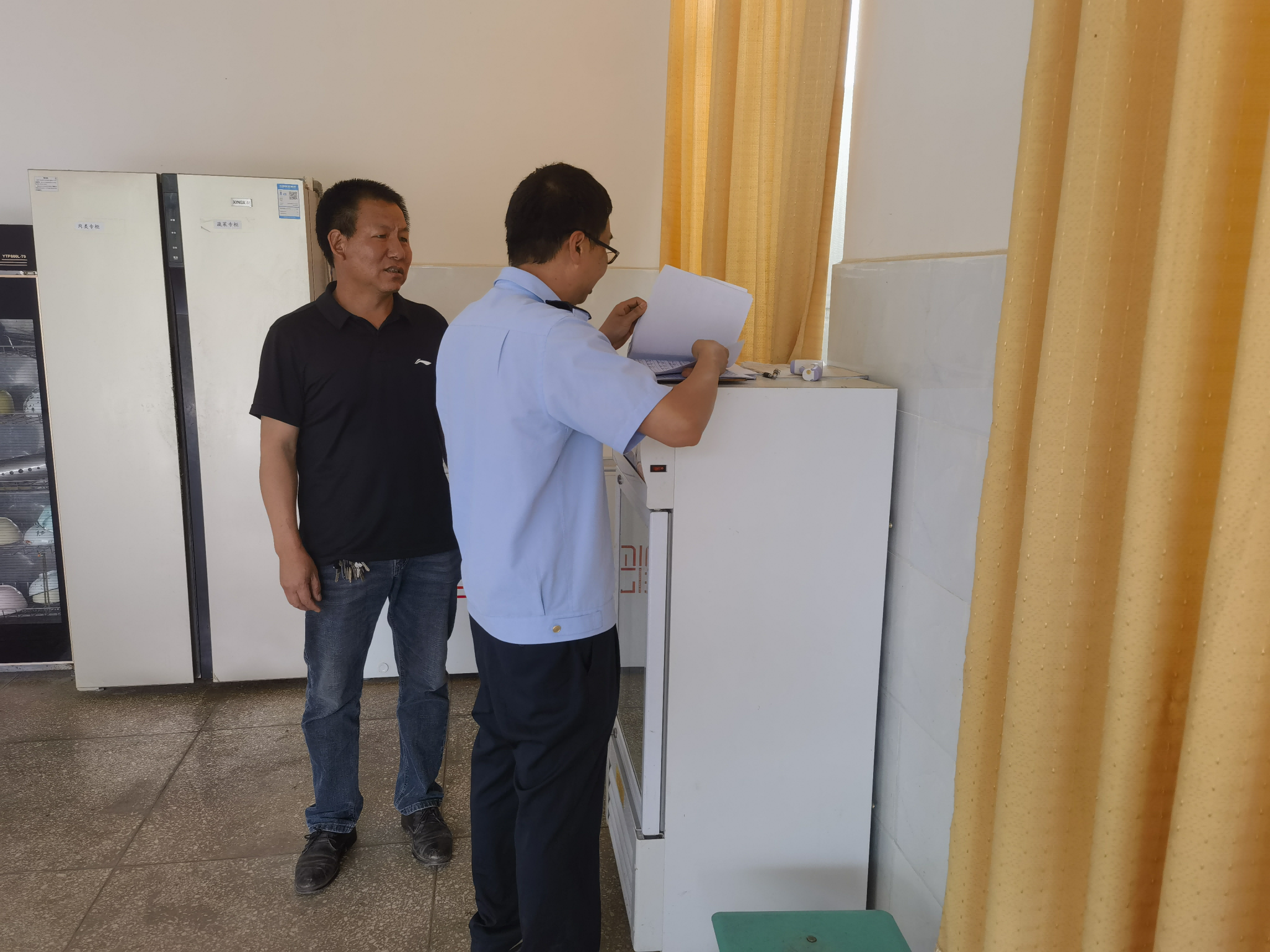 在检查过程中,执法人员一是对养老院食堂的食品经营许可证和从业人员健康证进行了仔细核查,确保经营资质合法合规,工作人员健康状况符合要求。二是认真查看食品原料采购台账,检查食品储存条件,要求食材必须来源正规、可追溯,且在适宜环境存放,防止变质。