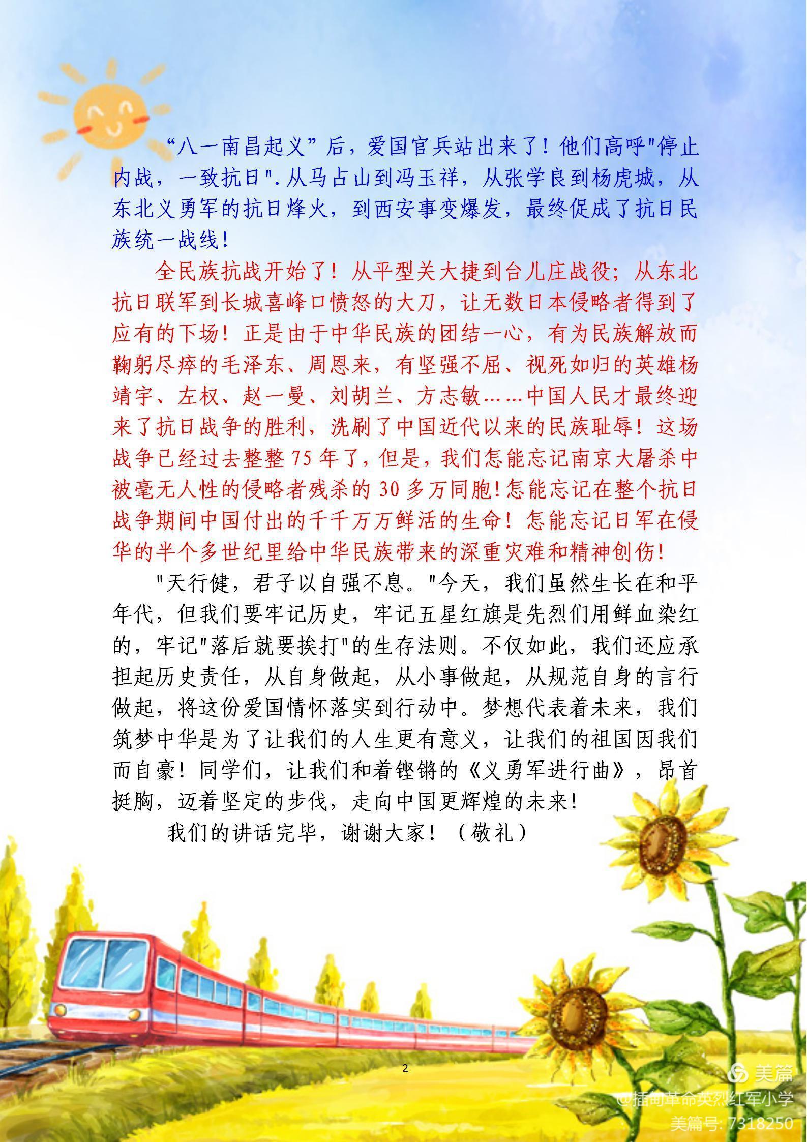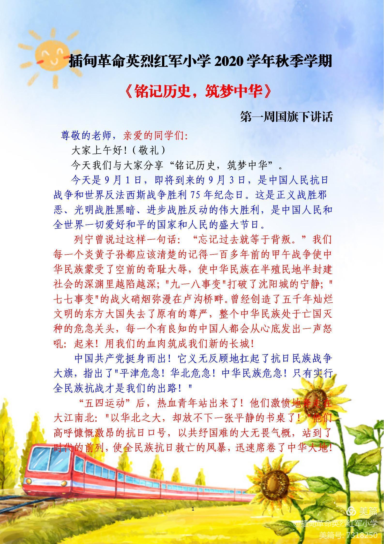 在2020学年度秋季学期开学之际,围绕纪念中国人民抗日战争暨世界反法西斯战争胜利75周年,插甸革命英烈红军小学利用9月1日国旗下讲话的契机,以《铭记历史,筑梦中华》、《新学期,我们会更精彩 》为主题,在师生间深入开展纪念活动,对全校师生进行爱国主义教育及文明礼仪教育。