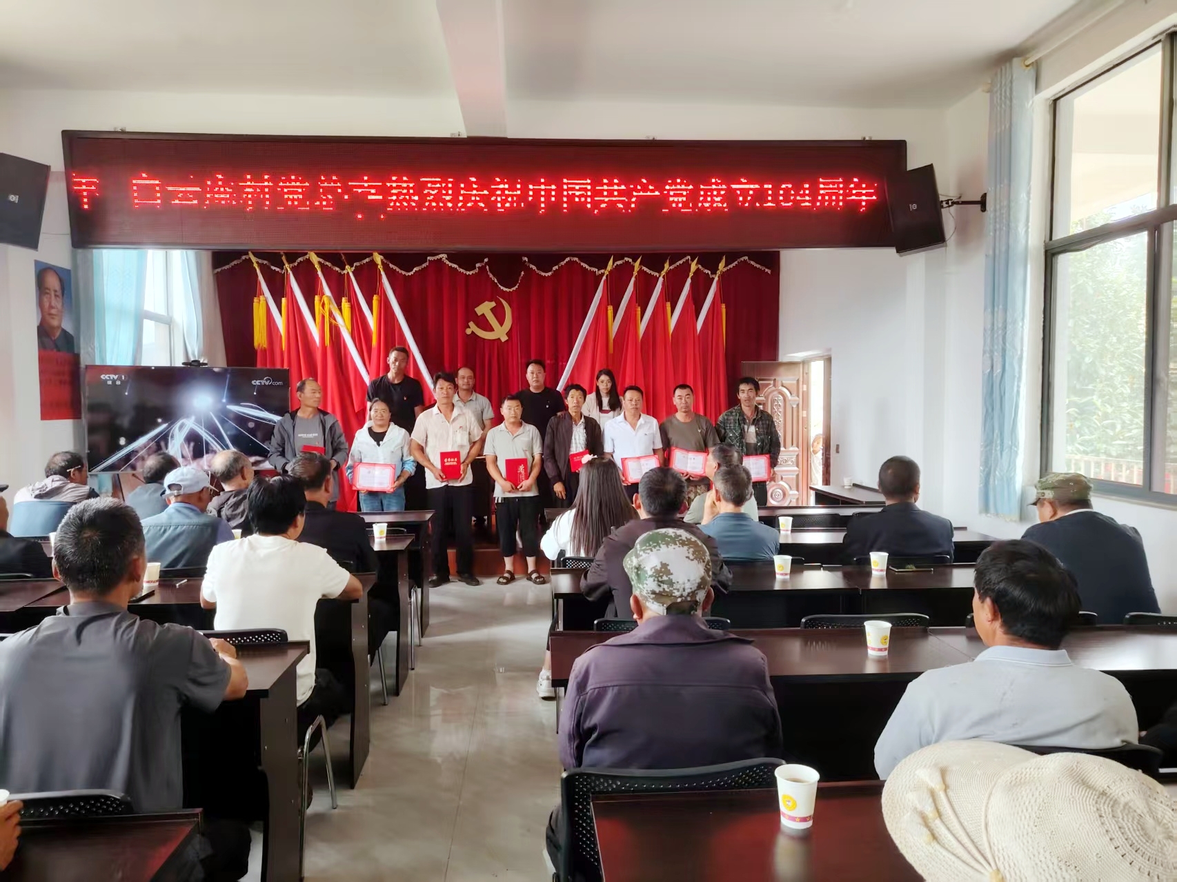 为热烈庆祝中国共产党成立104周年,回顾党的光辉历程,进一步激发全体党员的爱党爱国热情与干事创业激情,增强党组织的凝聚力和战斗力,7月1日,猫街镇白云庵村党总支召开庆祝中国共产党成立104周年表彰大会。