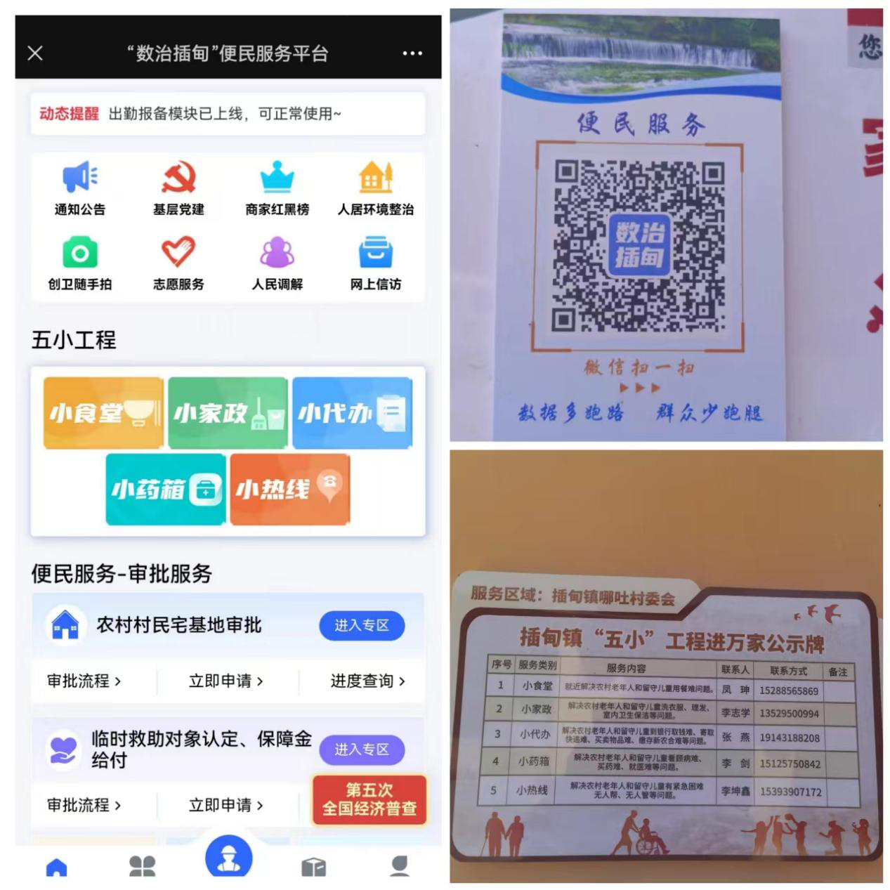 开发“数治插甸”平台,将全镇所有“五小”信息数据导入,设置分级分类管理、需求信息采集、订单推送、服务人员匹配等模块,同步微信小程序,通过数据平台直观反映全镇“五小”基本情况及需求、服务等实时情况。将全镇划分成统一的标准单元网格,把“五小”的服务组织、服务对象、助餐场所等纳入平台进行监管并分类统计。平台下设调度指挥中心、数据服务中心、运营维护中心3个版块,依托信息化平台,推出‘一老一小点单、数治平台派单、服务队伍送单、专项督导评单’的免窗口订单式服务模式。通过“网格化+信息化+人员化”的“一户一码”的工作体系,由“一老一小”本人、家人、邻里等根据微信小程序扫码进行事项申报、事项匹配、事项受理、事项处置的服务流程,以数字化手段开启全民参与“五小”工程服务新模式。由镇、村、组形成的包保责任人根据服务对象上报承接“五小”助餐、助医、助浴、助洁等自选居家有偿服务,提供助急、助行、助购、助学、助乐、助聊等基本免费服务。按照包保人员责任“一月一入户、一月一服务”的要求常态化开展入户服务工作。通过数治插甸平台联通,争取县民政支持,协同免费发放智能手环、平板等穿戴设备,逐步实现全覆盖。