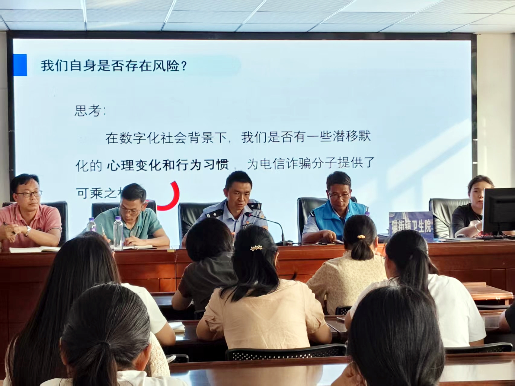 为切实提升医疗领域从业人员的反诈意识与防范能力,筑牢医患安全防线,7月7日,猫街镇组织司法所、派出所、平安法治办联合走进镇卫生院,开展“防范电信网络诈骗”专题宣传活动。活动通过“以案说骗”“互动答疑”等生动形式,为卫生院全体人员注入反诈“强心剂”。