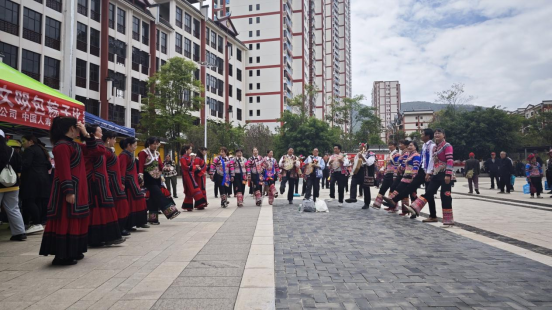 红幅绿篷筑风景,佳节歌舞添喜乐。走进泮池塘广场,彝族同胞们身着民族盛装,手持月琴载歌载舞,欢快的歌声与绚丽的服饰交相辉映,尽显地方民族文化魅力,为活动增添浓郁的民族风情。