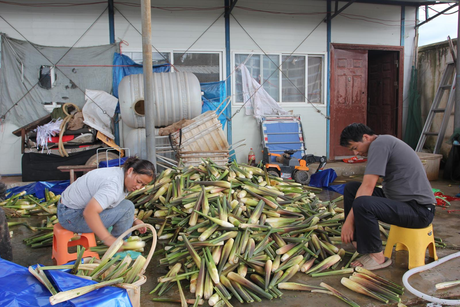 安德村委会安德村村民开桂兰一大早就跟伙伴们来到基地采茭白、清洗茭白。“我们这里有干计件的也有干点工的,干计件勤快的一天可以挣到200至300元钱,我干的是点工100元一天。基地还提供我们早晚两顿饭,每年从6月份开始我和伙伴们就相约在这里做活,我老公也在这里割茭白每月工资能领到6000元至7000元,在家门口上班虽然辛苦点,但比外出打工要强,既节省了房租、交通费、伙食费这些支出,晚上下班还能回去照顾家庭。”