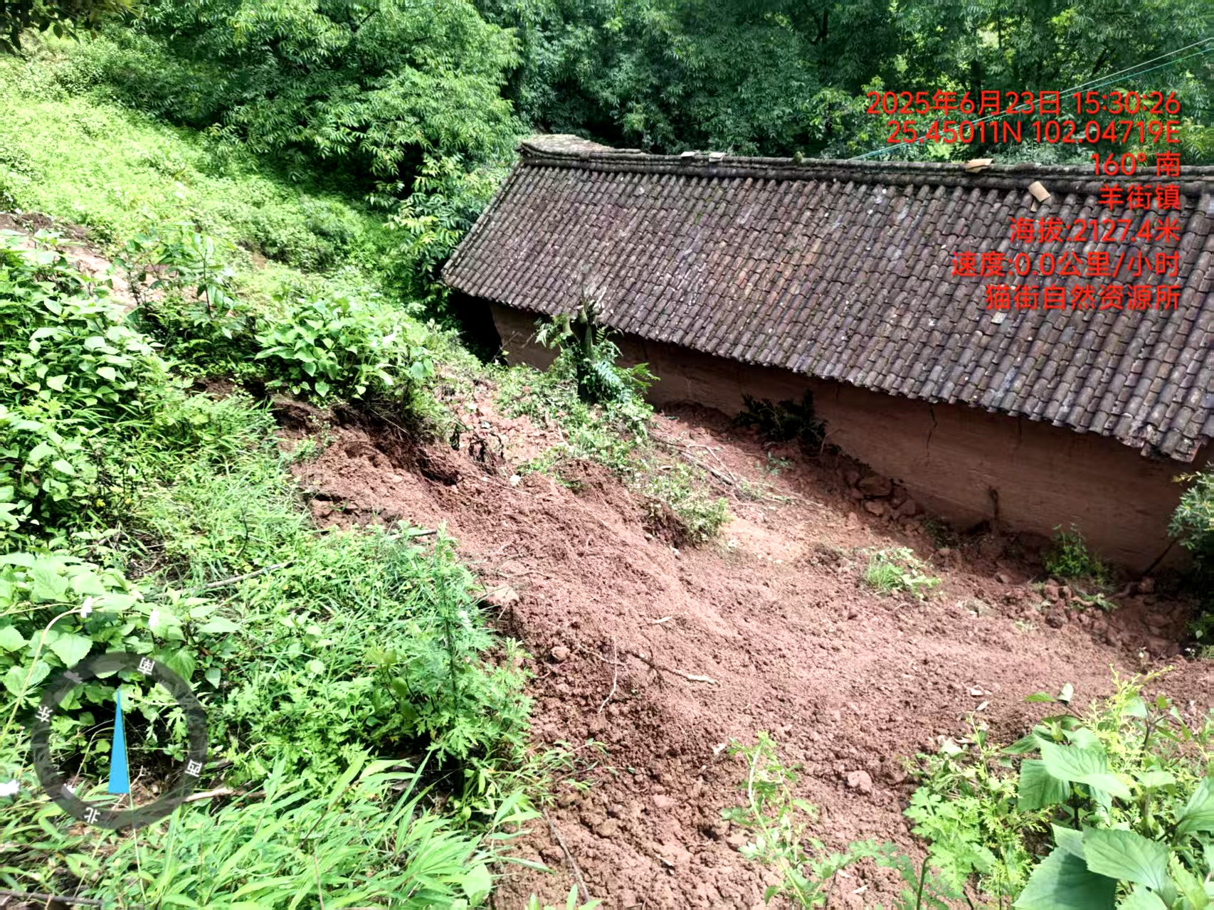 第一时间应急处置:科学高效响应,险情快化解。接到险情报告后,猫街镇应急指挥中心立即启动应急响应,由武定县自然资源局地质专家、镇应急队组成工作组赶赴现场。经现场技术勘察判断:坡下农户房屋随时面临滑坡威胁。“必须立刻转移群众!”应急管理指挥部果断决策,当即启动“提前避让+财产转移”的应急处置方案,妥善安置受灾群众至亲属家中暂住。同时,工作人员迅速在隐患点周边拉起警戒线,设置警示标识,防止次生灾害发生。
