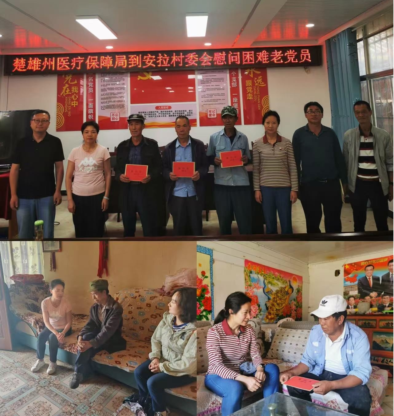 在庆祝中国共产党成立104周年之际,为弘扬党的光荣传统,传递组织关怀,楚雄州医疗保障局党组书记祝春燕同志带队,组织党员干部深入扶贫联系点插甸镇安拉村,领导班子成员分别走访慰问了困难老党员,向他们致以节日的问候和诚挚的祝福,送上党组织的温暖,干部职工走访了挂包联系户,了解群众需求;并邀请州中医院专家开展义诊活动,守护群众健康;举行太阳能路灯捐赠仪式,带来党组织最真切的关怀。