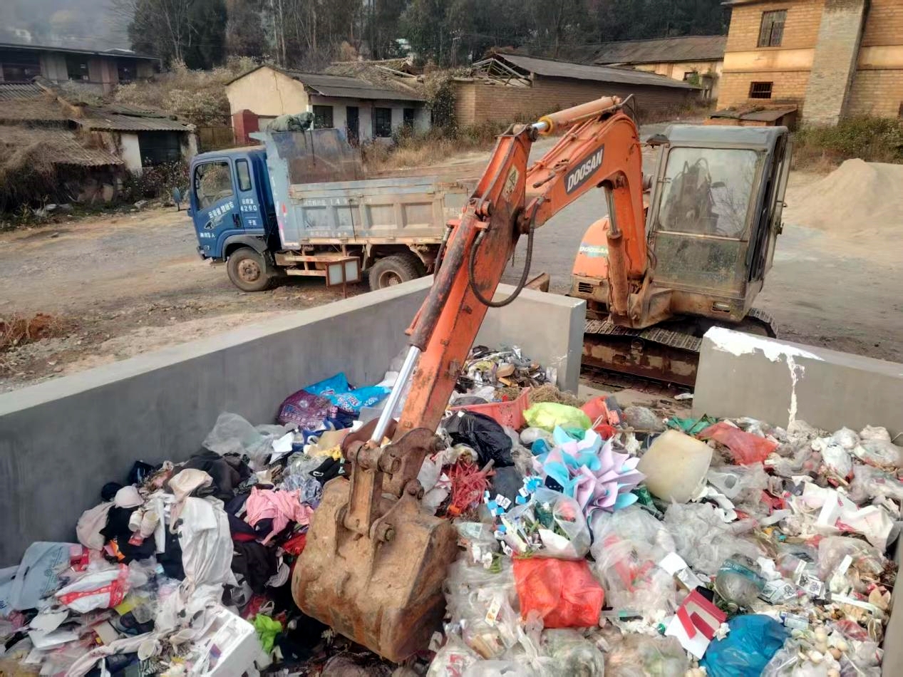 6月25,整治行动正式启动。村委会统一调配挖掘机、清运车辆等设备,并组织村干部、保洁员等人员,对全村主干道及支线两侧进行全面清理。挖掘机挥舞铁臂,将堆积已久的垃圾归拢到清运车中;对于沟渠堵塞区域,保洁人员徒手或借助火钳,分组协作清理,确保不留任何死角;在杂草覆盖区域,工作人员用火钳仔细清理隐匿其中的塑料袋、烟头。在村委会与村民的共同努力下,村内主干道路及垃圾池外堆积的垃圾被彻底清理干净。“以往光靠人工,得花费好几天时间,现在机械设备投入使用,一天时间村庄就焕然一新!”组织行动的村党总支书记古建南介绍到。