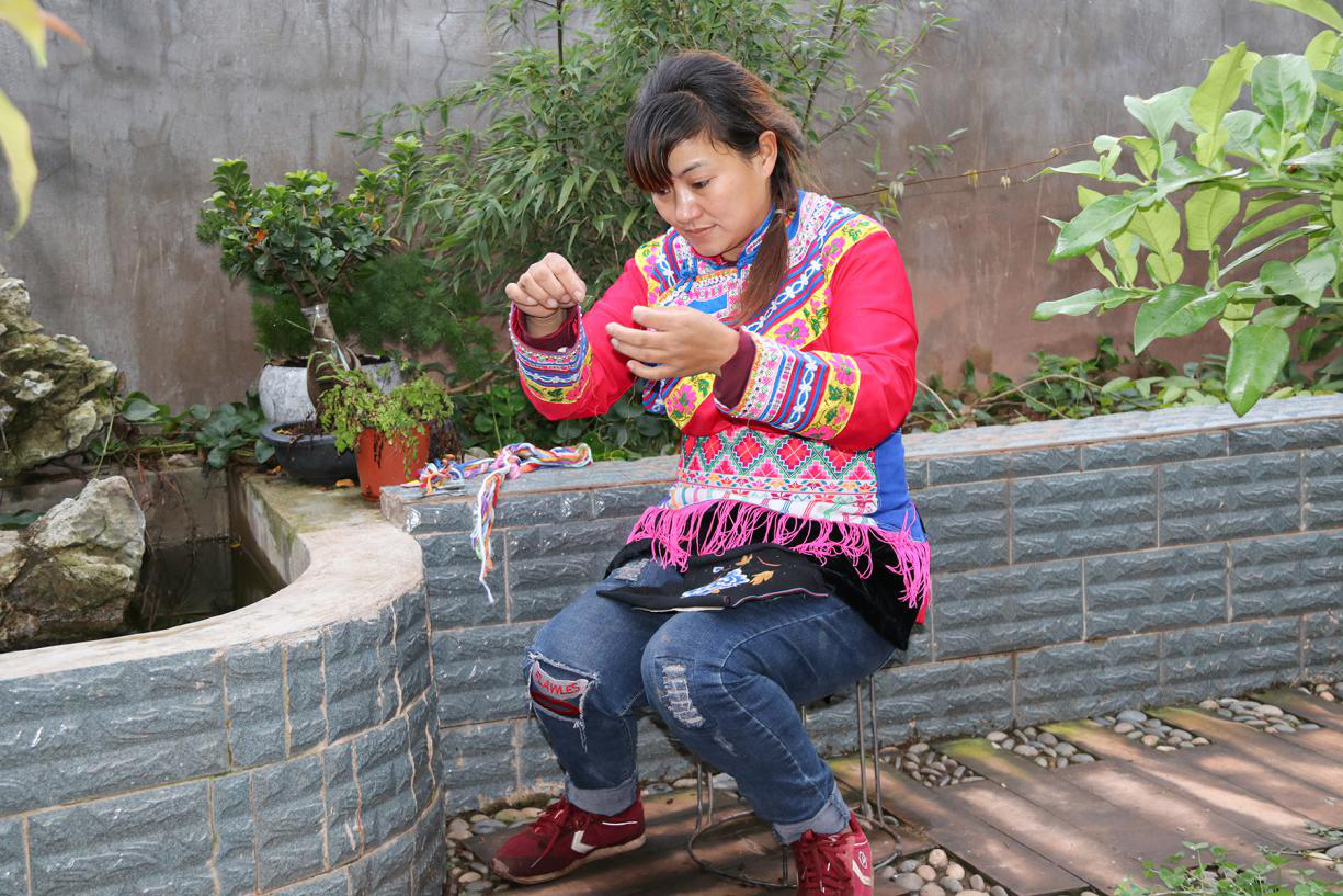 李从梅,是“挖掘彝绣之根,展示服饰之美,留住文化之魂”的民间绣娘,是武定县猫街镇仓房村委会仓房大村的村民,猫街镇传承彝绣专业合作社的法定代表人。2013年,李从梅家因老公股骨头坏死致残成为仓房大村典型的建档立卡贫困户;也就是在这个时候,身残志坚的老公凭借一根拐杖的支撑,以常人难以想象的毅力站立起来,成立了华兴艺术创作中心,以微薄的收入支撑了这个家。受残疾老公自立自强精神的感染,在社会各方力量的支持帮助下,她也不甘示弱,于2017年6月8日成立了猫街镇传承彝绣专业合作社。合作社现有管理人员5人,入社社员96人,其中,建档立卡贫困户71人。合作社以“成衣绣制绣品”为主营,充分吸纳民间彝绣爱好者加入合作社,采取“新型经营主体+订单收购+贫困户”的产业发展利益联结模式,带动本地区及周边建档立卡贫困户大力发展和传承绣产业,有效促进贫困户增收致富脱贫。一方面,无偿为社员们提供技术服务与支持,定期开展培训和营销活动。
