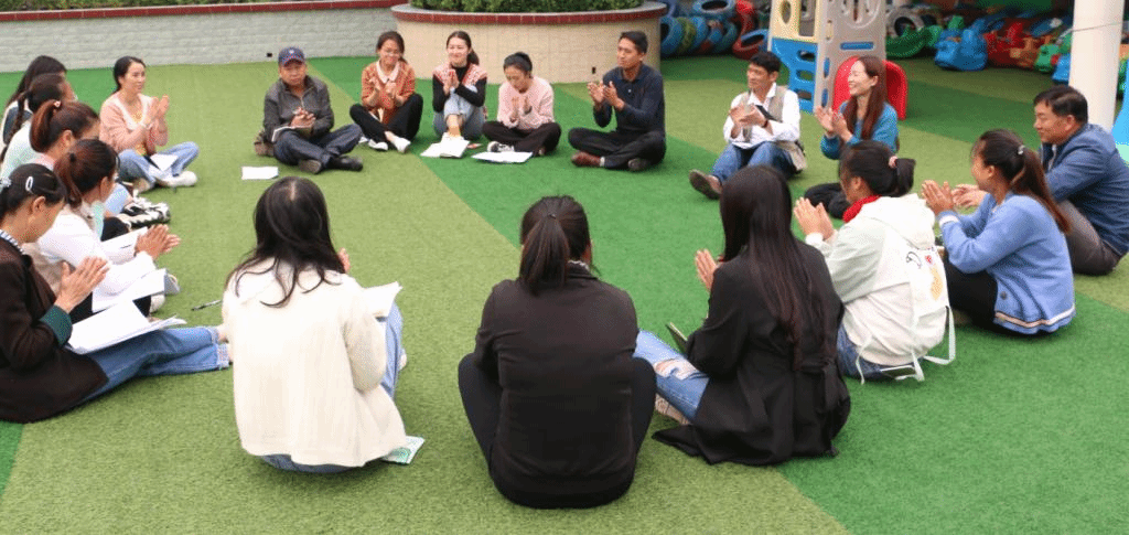 接下来,正式进入培训阶段,首先观摩了杨泽钰老师的大班体育活动示范课《疯狂的鞋子》、王晓丽老师的小班美术活动示范课《彩色星球》。观摩课结束后,两位老师与学员就“绘本课程设计理念”、“户外区域活动的设计与组织”两个主题进行了探讨和交流。