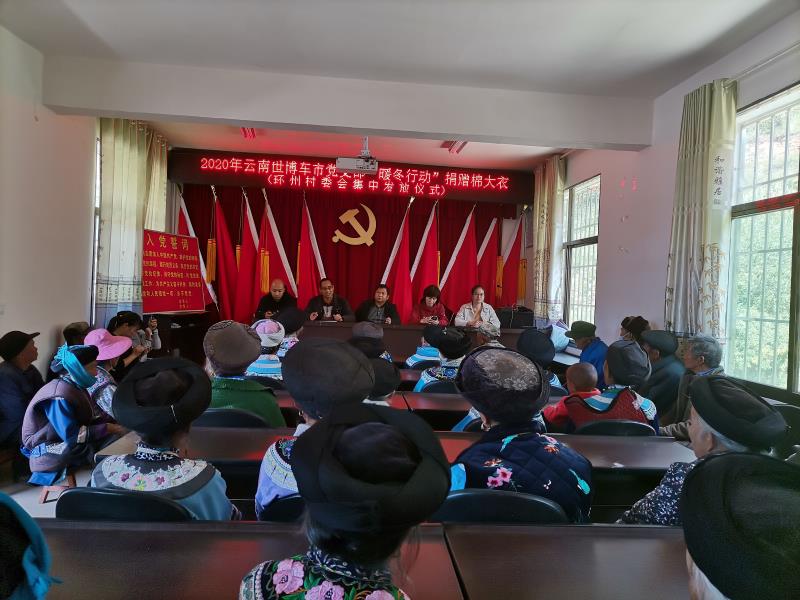 2020年10月27日下午,云南世博汽车市场有限公司梁经理等4人与县民政局雍副局长一行到环州乡环州村委会举行“暖冬行动”捐赠仪式,给部分建档立卡贫困户老人捐赠了爱心棉衣。
