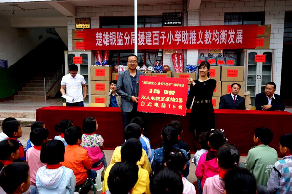 为真切关注贫困地区教育事业发展,关心少年儿童的成长,改善结对帮扶的百子村学校办学条件,6月22日,楚雄银监分局到武定县猫街镇百子小学开展助推义务教育均衡发展爱心帮扶活动。楚雄银监分局局长吴纯勇、副局长段有明、副处级调研员余美蓉等一行十余人到校开展活动。此次楚雄银监分局捐赠活动共向百子小学捐赠了包括电脑、电脑桌椅、储物柜、书柜、文体用品、小学生阅读书籍等物资近千余件,极大补充和完善了校舍、电教室、图书室、体育室、音乐室的教学设施,并为全体学生发放了每人一份学习用品。