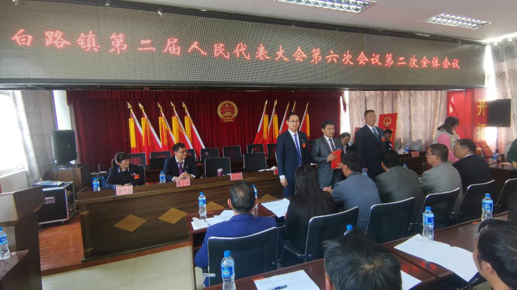 本次会议选举戍海春同志为白路镇人大主席团主席,选举虎圣槟同志为白路镇人民政府镇长,付平海同志为其颁发当选证书,两位当选人员进行了庄严的宪法宣誓。