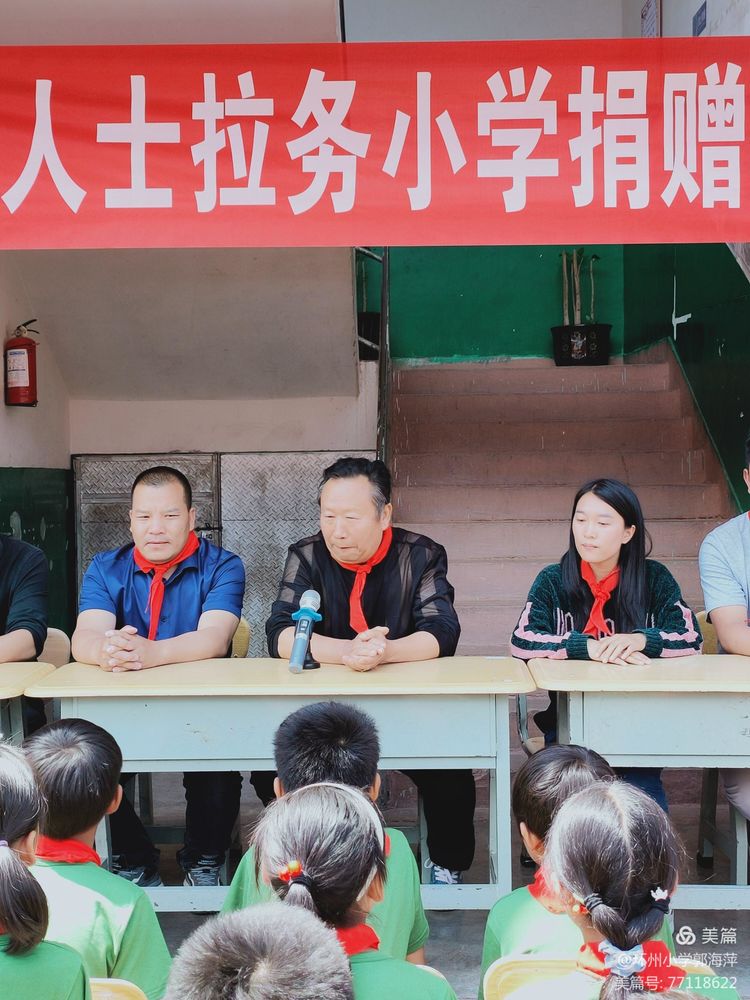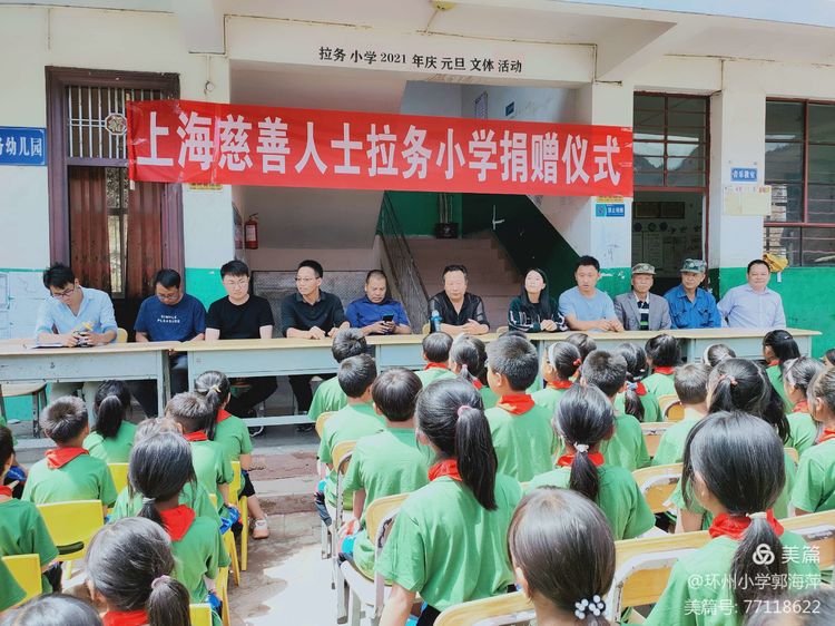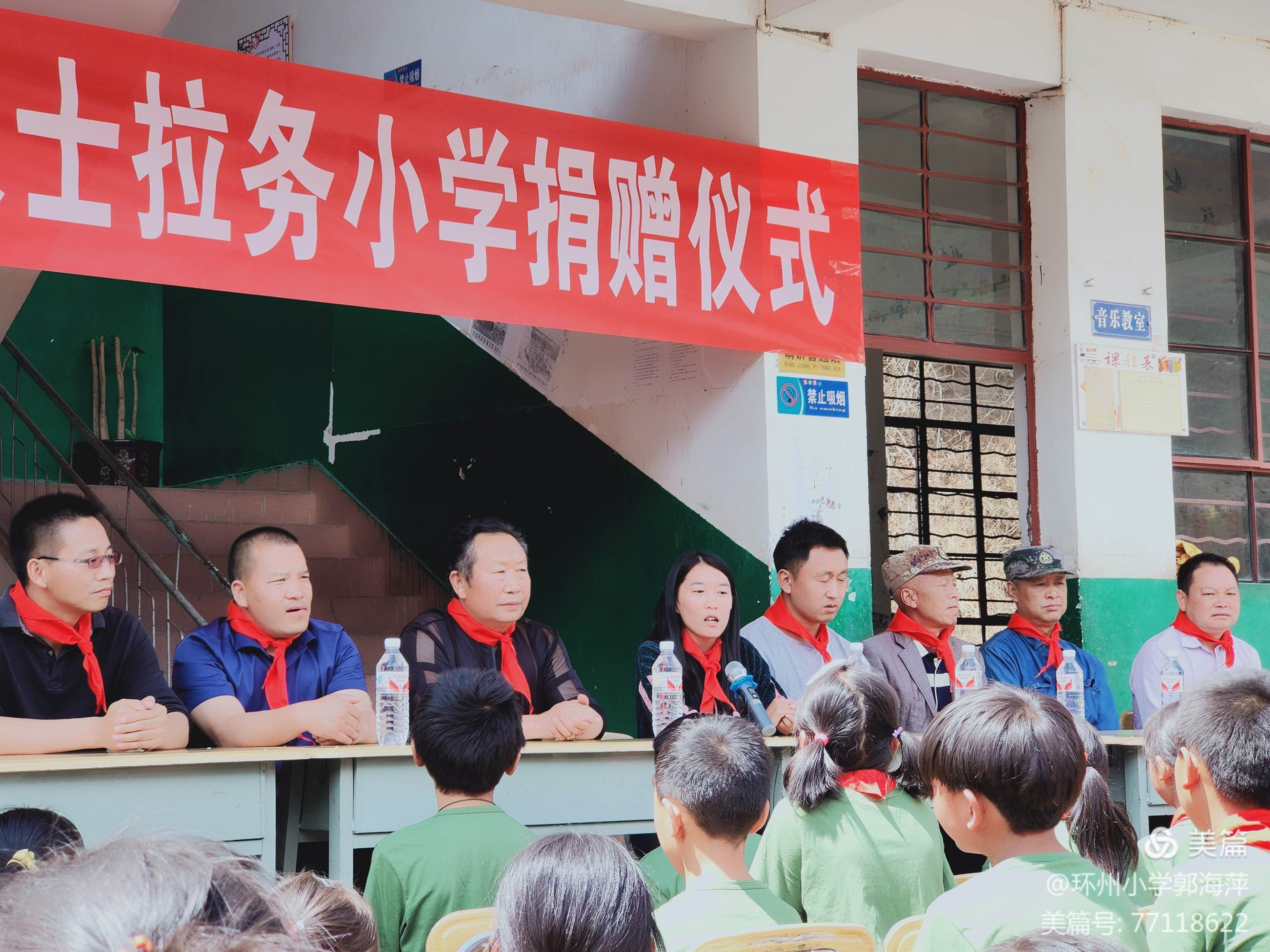 5月7日,一场充满爱心的捐赠活动在环州乡拉务小学如期举行,由胡友邦同志牵头,驻村工作队张春林同志的积极联络,为拉务小学的全体学生捐赠了人手一套夏季生活用品:夏装、凉鞋、水杯。另外为拉务小学的老师们捐赠了一台高科技教学机器人——小胖机器人,一台一体机电脑和一台打印机,为促进拉务小学的教学质量以及工作的开展提供有效帮助。上海爱心人士范永刚先生为拉务小学全体教师捐赠教学资金十万元整。用于教师培训、学术交流及师生表彰奖励。为助力拉务小学教育教学,开展乡村振兴支持教育工作。