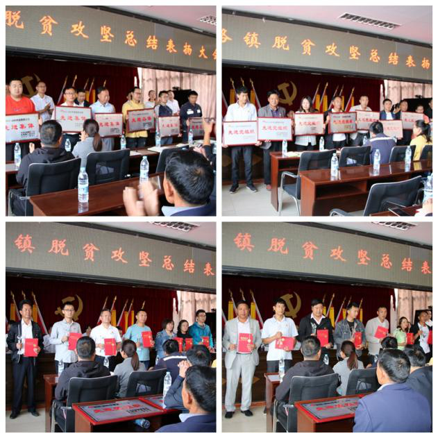 虎圣槟镇长宣读表扬决定,大会共表彰了农业农村服务中心等6家脱贫攻坚工作先进集体,白路村党总支等20个脱贫攻坚工作先进党组织及胡秀莲等72名脱贫攻坚工作先进个人,主席台领导为他们颁发证书和奖杯奖牌。