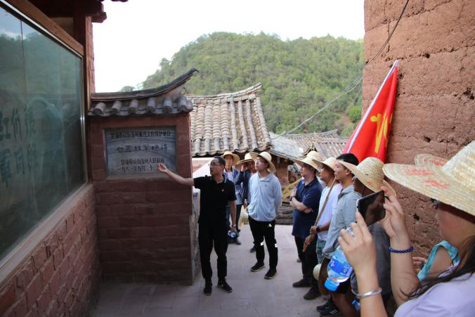 经过两个小时的急行军,队伍来到了木高古村,红军当年便是在木高古村夜宿一晚,留下了红军标语,在村口处,付平海书记向大家介绍着红军标语的历史,“夷民们同红军联合打龙云去”和“夷民们团结起来实行不交租不还债”这两条红军标语矗立在红军长征纪念馆右侧,这是红军当年夜宿木高古写下的标语,村民们为了保护这条标语,他们起初用草帘子遮挡、后用白泥覆盖,经过雨水冲刷才慢慢显现,后经修复还原才有了我们现在看到的样子。