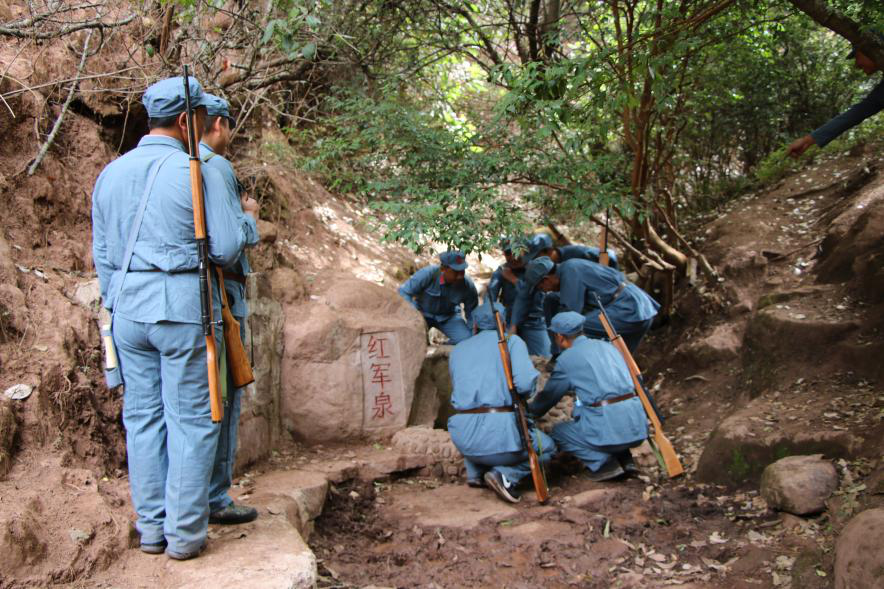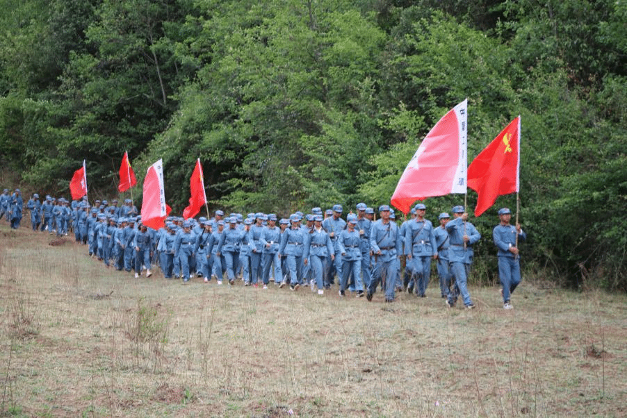 在党旗和军旗的指引下,尽管长征路是崎岖难行的山路,但队员们始终保持整齐的队形,个个昂首前行;沿途高唱红歌,洪亮的歌声在山谷中回响。经过草地、红军泉、红军树时,讲解员向大家介绍当年红军夜宿木高古时与群众的军民鱼水情故事。