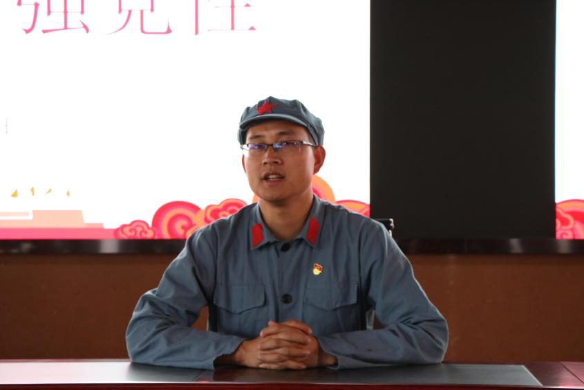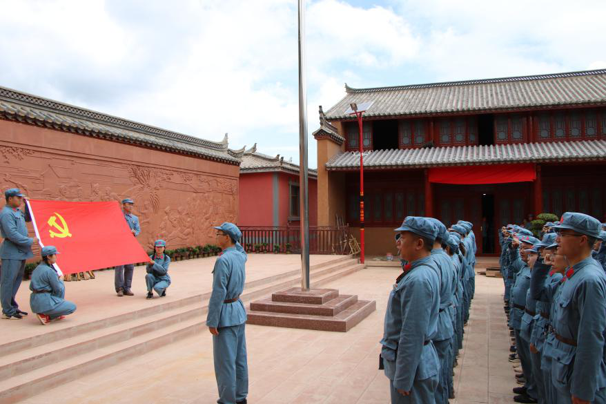 标语的正对面,红石浮雕墙上刻画着红军到木高古时与群众握手交谈、帮群众挑水砍柴的场景;广场上五星红旗高高飘扬,队员们在国旗下肃立,奏唱国歌,铿锵有力的国歌声,唱出了大家永远跟党走的坚定信念,以及对革命前辈的崇敬,对新时代中国的期望。在付平海同志的带领下,全体党员举起右拳,重温入党誓词,在党旗下作出庄严承诺。