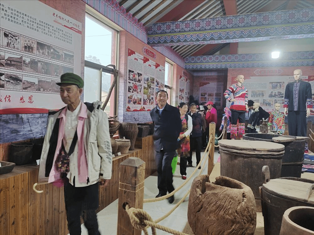 老木坝村村民给前来参观的文艺队介绍说:“2018年以来,先后争取1000多万元建设美丽宜居特色村寨,投入帮扶资金300万元开展村庄清洁和绿化行动,推进“美丽家园”建设。在省委组织部的帮助下,村民们通力协作收集诸多以前的生产生活用具和傈僳族传统服饰在这里展出,让乡亲们留住乡愁。”