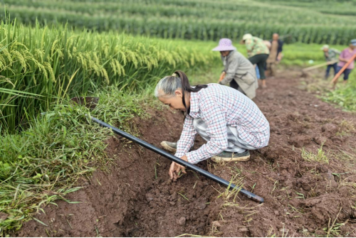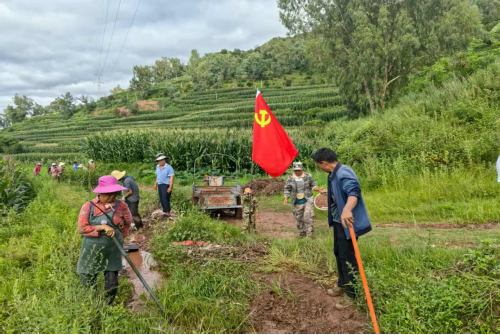 接到群众反映后,田心村党总支迅速行动,组织村干部实地勘察路况,第一时间制定修复方案,组织党员干部、群众共同投工投劳对禄丰村机耕道路及放水沟进行清理修复。施工现场,锄头挥舞、铁锹起落,党员们冲锋在前,挥汗如雨填补坑洼;村民们紧随其后,默契配合清理杂草、平整路面。大家分工明确、干劲十足,原本泥泞的道路在众人合力下逐渐变得平整坚实,为农耕生产打通了“生命通道”。