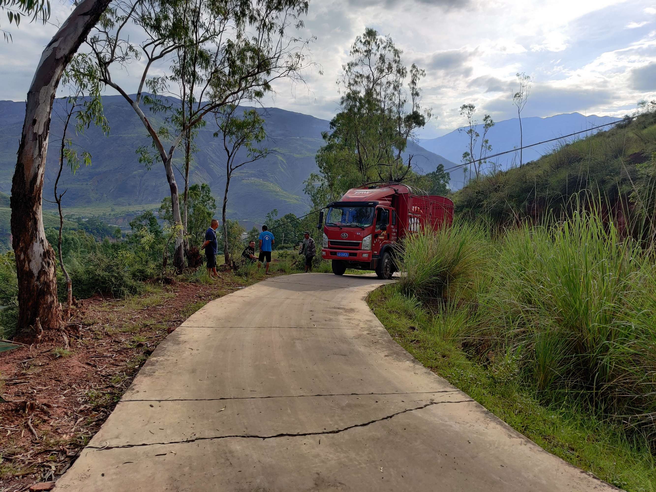 赶到现场后,了解到情况系一辆外乡送货车辆途经东坡乡东坡村委会东坡四组村间道路与环东公路岔口时因为不熟悉路况和驾驶不慎导致货车车顶挂到路面上方经过的电缆线,大货车进退两难!