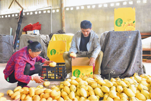 眼下正值芒果成熟的旺季,位于武定县田心乡的文芒家庭农场也迎来了丰收的季节。在这个有着一万多棵芒果树的农场里,新鲜采摘下来的芒果被堆成了一座金灿灿的小山,空气中满是芒果的香甜。工人们熟练的将芒果进行分拣、称重、打包、装箱,农场里一派繁“芒”的丰收景象,奏响了乡村振兴的“增收曲”。
