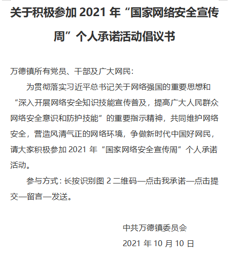 万德镇党委向辖区广大党员干部和网民发出了《关于积极参加2021年“国家网络安全宣传周”个人承诺活动倡议书》,共有党员干部80多人作出了庄严承诺。