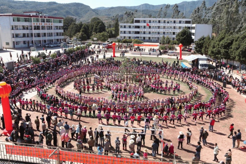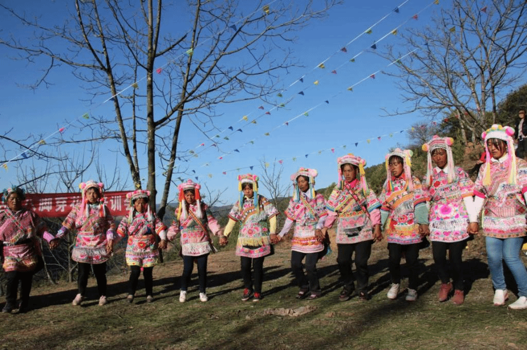 其特色舞蹈要数跌脚舞,每逢节日或娶媳嫁女的喜庆日子,在村落集中的地方,只要笛子、三弦一响,无须召唤,人们就会随之起舞,舞者不限,少则十几人,多则几十、几百、甚至上千人。跌脚的时候,人们围着篝火,手拉手围成一个大圈,男的或弹弦子,或吹竹笛,女的歌唱,有节奏的运步跌脚,参舞者有小至七八岁的儿童,老到年逾花甲的长者,有的年轻父母甚至背着小孩上场,到了这种场合,真可谓“笛子响,脚板痒”。跌脚舞分“一边一脚”至“十二脚”,“单穿花”至“八脚穿花”,以及“公鸡啄架”、“马四蹄”、“赶跌”、“转跌”、“背靠跌”、“交叉跌”等20多种套路,加上笛子、小三弦等伴奏,显得活泼热情,粗犷豪放,深受各族群众的喜爱。