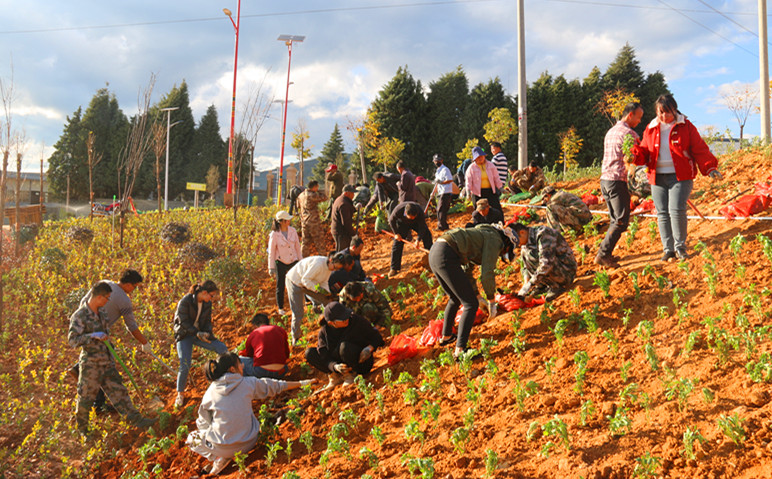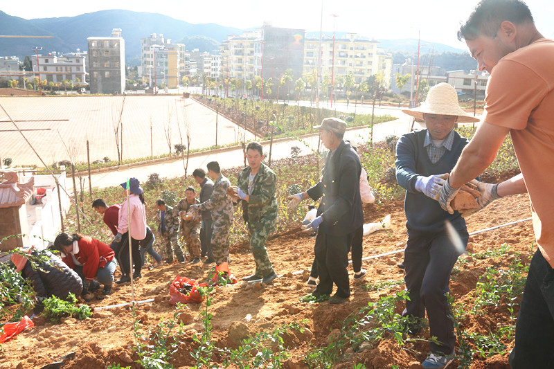 11月28日中午,插甸镇党委书记张美权和镇长宋春宇组织插甸镇干部职工联合各村护林员等60余人集中开展环境美化种树种花活动。