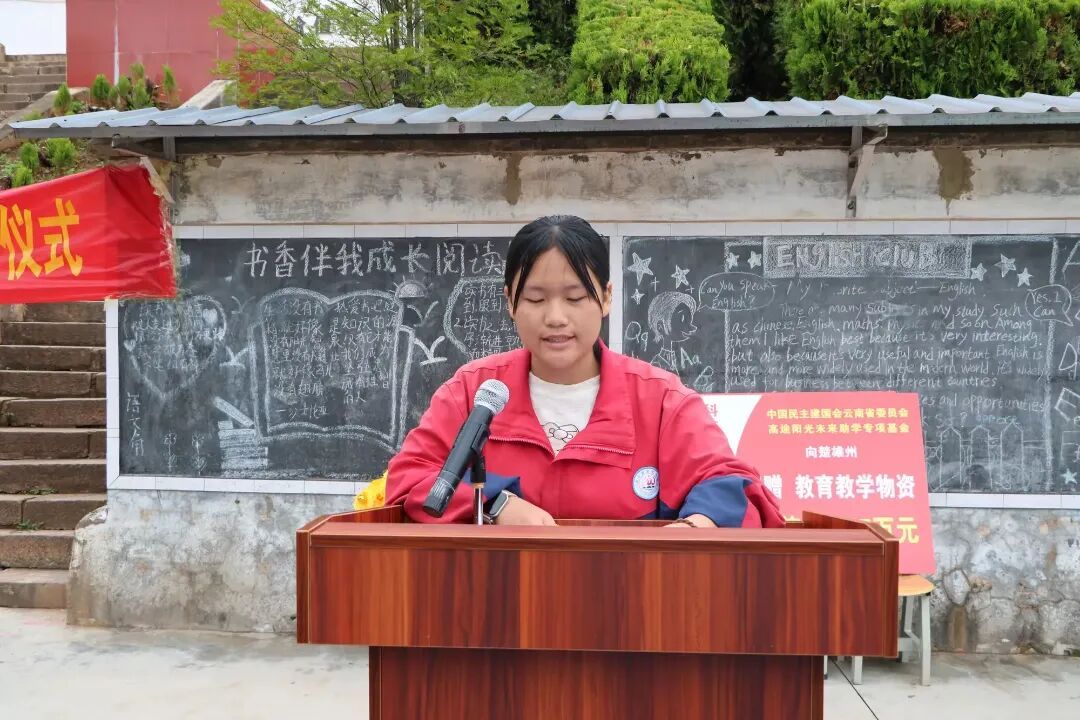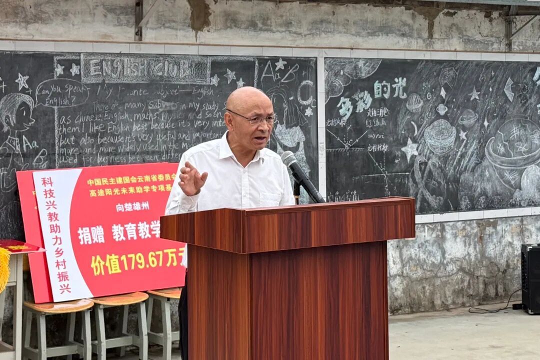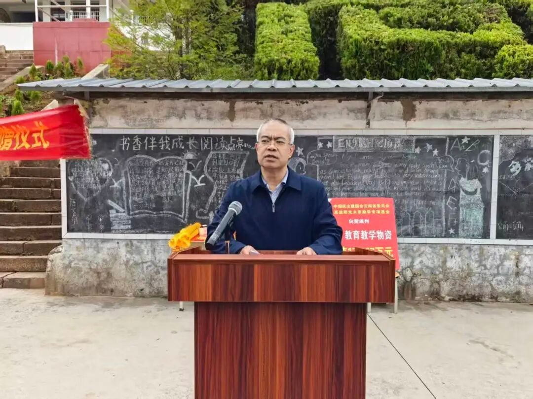 民建楚雄州委专职副主委赵勇代表捐赠方讲话。他指出,希望同学们珍惜美好的学习时光,充分利用好捐赠物资,刻苦学习,不仅掌握扎实的文化知识,更要培养科学精神和创新意识,努力成长有理想、有本领、有担当的新时代好少年,将来为建设家乡、振兴乡村贡献智慧和力量。