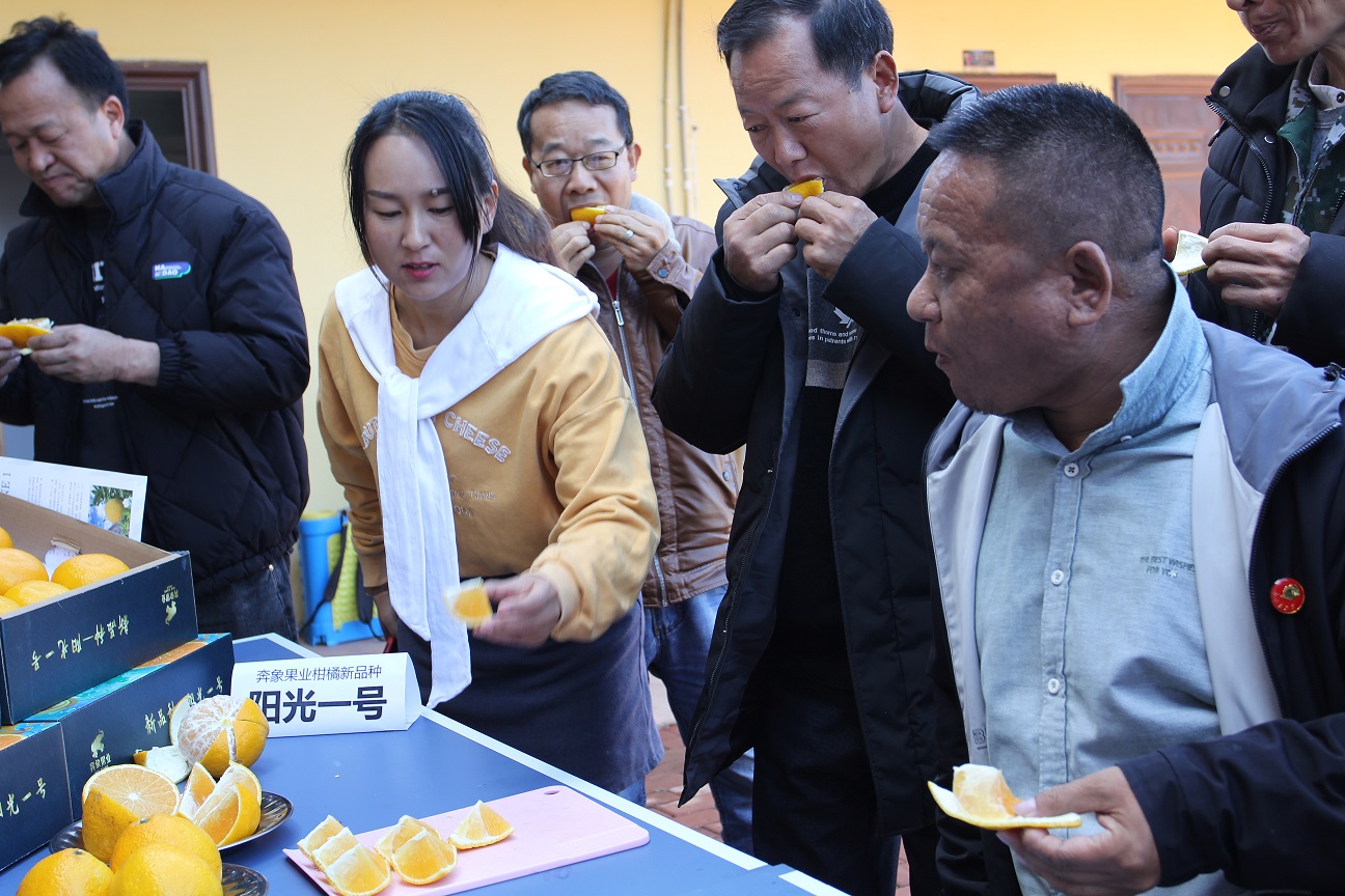 上午11点,参加活动的各位嘉宾正式入园体验柑橘采摘和参观奔象果业阳光一号场地供应链。基地里一个个金黄的“阳光一号”柑橘挂满枝头,坠弯了树枝,十分惹人喜爱,嘉宾们穿梭于橘树间,忙着观赏、拍照、品尝。“我们‘阳光一号’具有桔、橙、柚的综合风味,糖度适中,水分足,皮薄肉多、无核化渣,采后常温储存,可储存3个月,口感,风味不变,耐储运,货架期长,商品性极佳。”基地负责人于恩齐忙里忙外,不断向嘉宾们介绍。