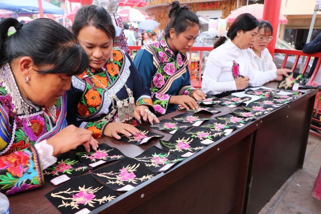 三是汇聚多元力量,打造协同共治营商生态。引入摩尔农庄签订有机核桃产业发展协议,通过“企业+基地+农户”模式提升产品附加值,依托商会平台打造 “生态 +产销” 破局模式,推动发窝冬桃、火腿、野生菌、胡蜂等特色产品销往楚雄、昆明等地。创新“会+节庆经济”模式,承办桃花节、“六月六”、彝族年等活动,组织斗牛、酒歌赛、长街宴等特色项目,年吸引游客超10万人次,拉动消费与市场主体培育双赢。培养非遗传承人4名、少数民族代表120名。国家级彝族酒歌传承人余学光、苗族刺绣代表张艳等成为文化品牌代言人,推动非遗技艺向市场产品转化。
