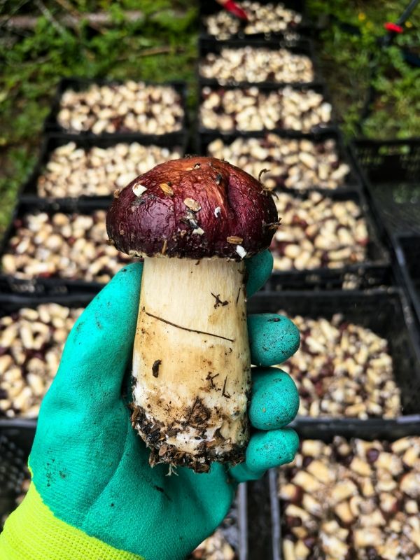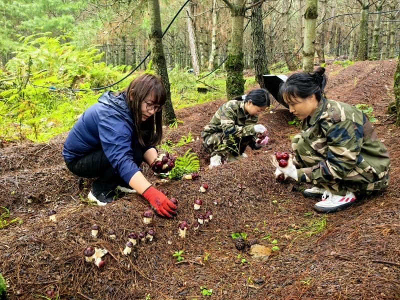 赤松茸又名大球盖菇,是一种珍稀食用菌,成品鲜菇色泽艳丽、食味清香、营养丰富,享有“素中之荤”“菌中之王”的美誉。“赤松茸的最佳生长温度是8—20℃,这里非常适合,松林挡大风又通风,氧气充足,菌丝生长旺盛;而树林中的散射光,可以很好地满足赤松茸对光的需求;加之林下环境比较稳定,略微潮湿,长出来的菌菇品质就非常好。像这种,搭配点酱油和芥末就可以直接生吃,味道很鲜美。”李孟芩笑着介绍道。