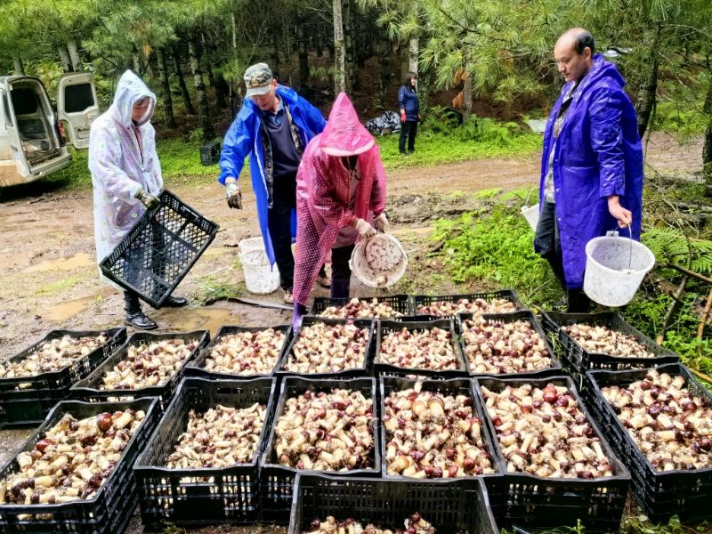 “我们6月中旬开始种植,没想到短短2个月就出菇了,这已经是我们采收的第4茬了,估计可以采到11月底。今年雨水充足,昨天刚采过,今天又冒出来一批,平均每天可采鲜菇1000公斤。”团碑村党总支书记张蔓华激动地说:“一亩林地一季大概能采摘2000公斤鲜菇,按照目前8至10元/公斤的收购价,预计今年可实现产值100余万元。